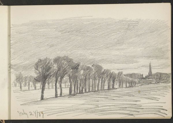 Willem Witsen made this landscape with a cityscape using graphite, probably en plein air, capturing the scene with an economy of means. The process feels immediate, like he’s chasing the light as it shifts across the flatlands. Look at the texture he achieves, it’s all graphite on paper but the trees have a feathery quality, a scribbled intensity that contrasts with the smooth, almost smudged, ground. The sky is barely there, just a few strokes suggesting clouds, but it’s enough to give a sense of depth. It’s all about suggestion rather than description. The signature in the foreground is almost the most defined mark, a flourish that declares the artist’s presence, it's part of the drawing itself. It reminds me a little of James McNeill Whistler, particularly his etchings, in their shared interest in atmospheric conditions and tonal effects. But Witsen is perhaps a bit more direct, less concerned with aesthetic refinement, and more interested in the raw experience of being in the landscape. For me, art lives in this space, it is a form which embraces ambiguity.