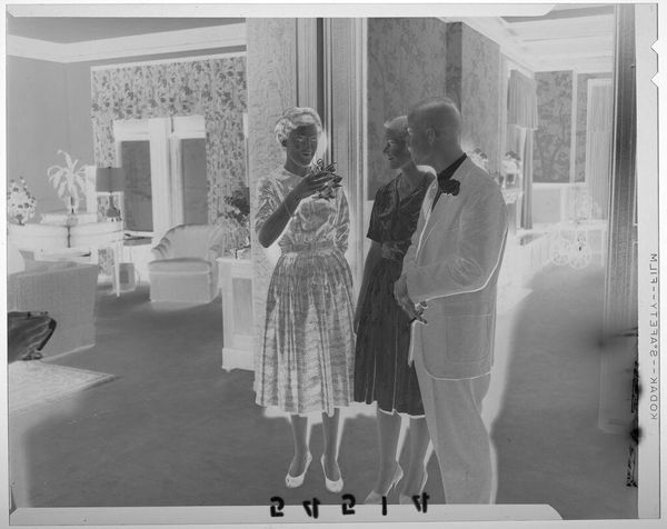 Editor: This photograph by Martin Schweig, titled "Untitled (three young women chatting in fancy living room at party)" shows just that. The women's dresses are so detailed, and it looks like the photo itself is a negative! What stands out to you about this image? Curator: Considering this image, I focus on the materiality of the photograph itself. The Kodak markings, the negative space – these are as important as the social scene depicted. How does the process of image creation influence our understanding of leisure and social class in the mid-20th century? Editor: So, you're saying the medium is the message here? Curator: Precisely! Think about the labor involved in producing these images, distributing the materials, and consuming the final product. It's all intertwined. I’ve certainly got a lot to think about now. Editor: Me too! I'll definitely look more closely at the production details moving forward.