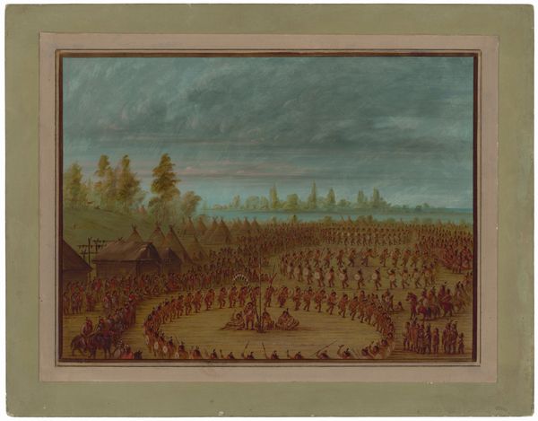 Curator: George Catlin, painted around 1847-48, captured "La Salle's Party Feasted in the Illinois Village, January 2, 1680." A watercolor piece. What strikes you about it initially? Editor: The overwhelming feeling is a certain stillness. It’s like the moment right before something significant happens, all eyes focused on that central fire. And look at the huts, they appear more fragile than functional for the harshness of the climate. Curator: Yes, that stillness. There's an almost dreamlike quality to the pale sky and the snowy ground, lending it an air of solemnity. This work almost acts as a time capsule, attempting to freeze a moment of intercultural contact, rife with complexities we can only begin to imagine. Editor: I’m drawn to those tent-like structures, which resemble domed shelters covered in hides. Notice how the artist delineates a space, emphasizing this location for communal meals, rest, and storytelling. What hides do you think they are made from? Considering the weather, I'd venture the party were consuming lots of food to stay warm. The amount of labor it takes to make such hide, I find amazing. Curator: Absolutely. And it makes you ponder about Catlin himself, doesn't it? A white man painting this scene, undoubtedly from a position of power and observation. There's a responsibility in representation that cannot be ignored, what stories do you think Catlin attempts to create here? Are they true to reality? Can they ever be? Editor: A crucial point. These paintings can serve as invaluable documents, offering visual narratives of practices and relationships long altered by colonialism. This highlights both the opportunity and obligation of representation. I imagine those tents held so much information and resources from that local economy. What kinds of foods did the land yield? How did their lives contrast with those of the visiting party? Curator: It’s a potent reminder that history painting is never neutral, and even with good intentions, our perspective inevitably colors the narrative. How the simple campfire turns into a meeting of worlds. Editor: It forces a closer inspection of the details, revealing deeper implications about labor, resources, and representation in historical documentation. The party and tribe probably took materials and technologies home from that meeting also! Thanks for painting that larger story.