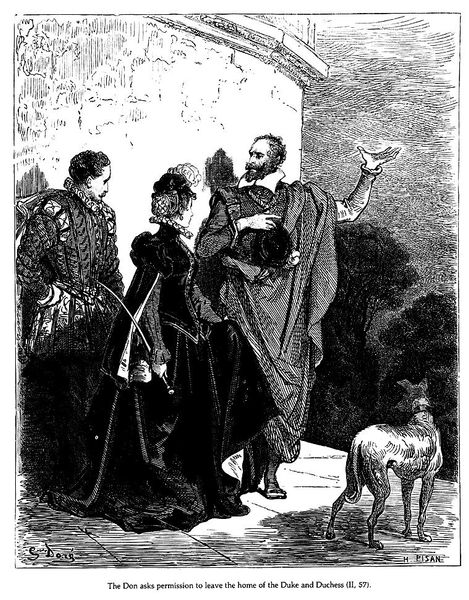 This illustration of Don Quixote was made by Gustave Doré in the 19th century, a period marked by significant social change and industrial advancement that influenced art and culture. Doré's image captures a scene from Cervantes' novel, where Don Quixote, a man lost in his own fantasies of chivalry, finds himself amidst a group of noblewomen. The scene is ripe with gendered dynamics, and class distinctions. Quixote, in his delusions, challenges the norms of his time, yet he remains a figure of the landed gentry, with all the privilege it implies. Doré, like Cervantes, invites us to consider how individuals construct their identities and what happens when those identities clash with the expectations of society. The emotional depth of the work lies in its portrayal of Quixote's struggle for recognition, his longing for a world of honor and adventure, and his eventual disillusionment. Through Doré’s lens, this is more than just an illustration; it's a commentary on the nature of identity, the power of imagination, and the constraints of society.