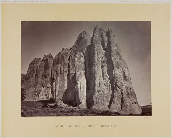 Curator: Timothy O'Sullivan's “Bluff Opposite Big Horn Camp, Black Canon, Colorado River" presents us with a striking view of the American West. The stark, almost monochromatic tones give it a powerful presence. Editor: It feels so monumental, but desolate. I wonder about the colonialist implications of representing this landscape as empty, ready for extraction and exploitation. Curator: Indeed. O'Sullivan was part of government survey expeditions. His photographs served a practical purpose: resource mapping. The very act of photographing transformed the land into a commodity. Editor: Exactly. This isn't just a landscape; it's a document complicit in westward expansion, displacing indigenous peoples and transforming ecosystems. Curator: Thinking about the wet plate collodion process he used, it's amazing that he could capture such detail under difficult field conditions. Editor: I agree. Thinking about it now, it is hard not to consider the human cost of that "achievement" in a critical light.