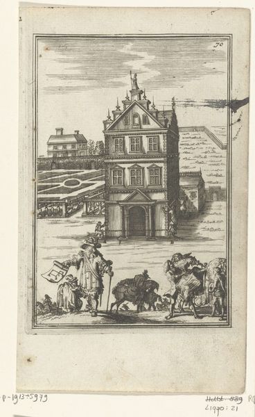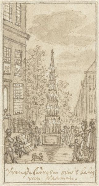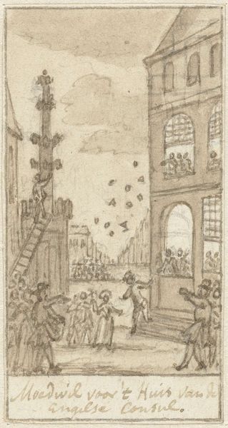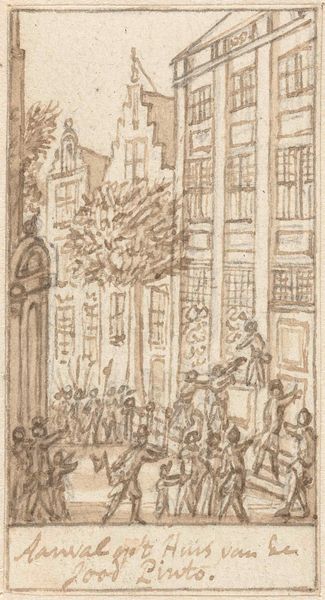 Simon Fokke created this drawing, "Plundering van het huis van kapitein Spaaroog tijdens het Aansprekersoproer te Amsterdam, 1696," using pen in gray ink and brush in gray wash. The composition is dominated by the detailed rendering of the house under siege, set against a muted sky. The artist’s use of line and wash creates depth and texture, particularly in the chaotic scene of rioters and flying debris. Fokke’s style reflects a keen interest in capturing the raw energy of social upheaval. The scene is charged with semiotic weight, where the act of plundering itself becomes a signifier of broader social discontent. The house, once a symbol of stability, is destabilized. Through a formalist lens, the drawing's structure, with its emphasis on dynamic lines and tonal contrasts, mirrors the disruption and re-evaluation of societal norms during the Amsterdam riots.