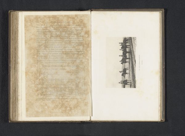 Curator: Here we have "Vier kinderen spelen in een meer," or "Four Children Playing in a Lake." This albumen print, captured before 1898, is by A. Mazel. It's striking, presented as an image within the leaves of an opened book. What are your first thoughts? Editor: It has such a dreamy quality! The soft focus lends an ethereal, almost melancholic feel to what should be a scene of carefree play. The trees are very dominant in the foreground and overshadows what is probably a joyful interaction. It suggests some weight on these innocent lives. Curator: That's fascinating. Pictorialism, the style this piece aligns with, very much intended to elevate photography to the level of art by manipulating the image. Consider also the rapid urbanization happening. How might Mazel's choice to focus on children in nature, away from industry, play into the larger socio-political discussion on industrialization? Editor: Right. So the lake becomes a stage for cultural memory and a site of innocence in an era undergoing immense societal upheaval. That's also represented by the fact that the viewer looks upon a scenery where symbols of vitality in its organic state interacts with an environment reflecting modern living, yet remains very simple, authentic and balanced in its message. But if we are on the topic of the water and reflections, isn’t the symbolic purification central? Curator: Exactly! These landscapes allowed people to look towards childhood—and even nature—to consider what industrializing cities took from their children. Also, the decision to present the image within the album suggests an awareness of the constructed nature of photographic truth. And possibly some desire to show a connection to older means of artistic production. Editor: It becomes more like an artifact then; preserving not just an image, but the experience and ideals associated with it. I find that interplay particularly poignant, now having these extra bits of context, as this imagery persists even to our current times. Curator: A truly remarkable moment frozen in time and, in a sense, for all time.