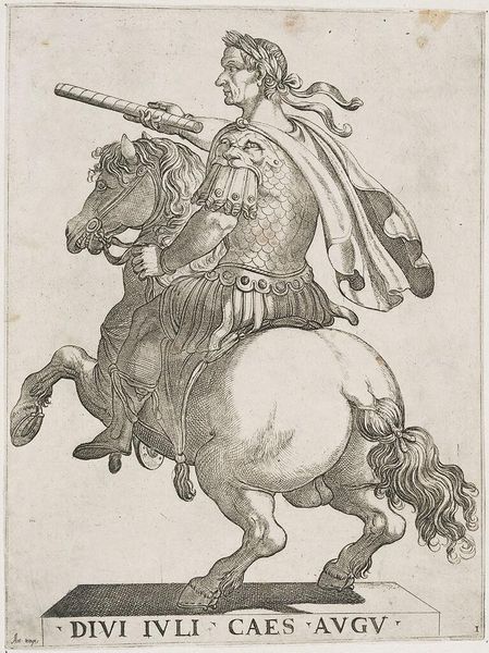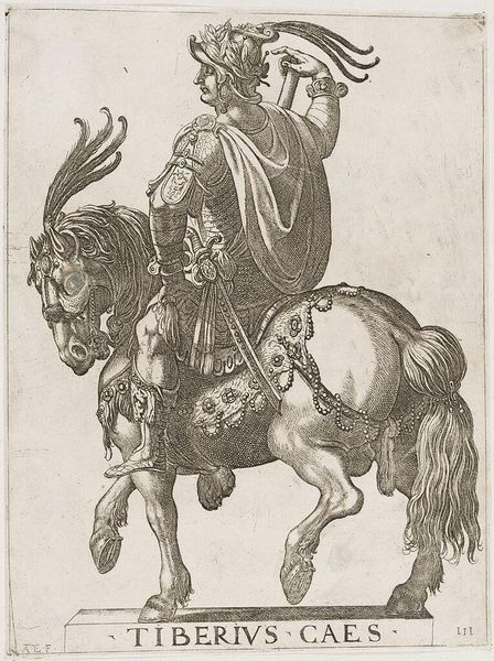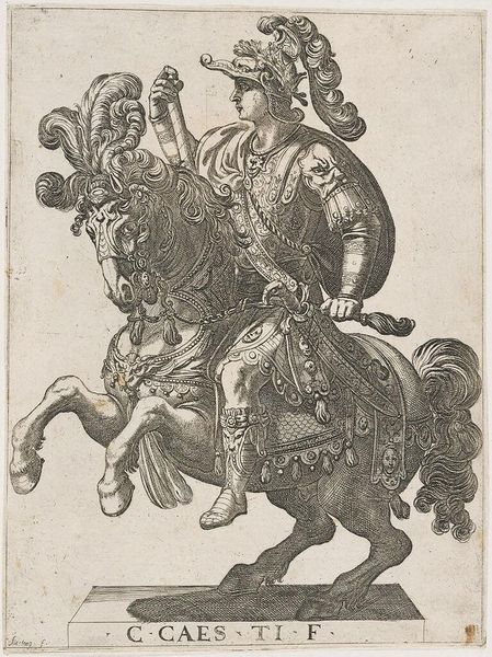 Editor: This is Antonio Tempesta's "Emperor Otho on Horseback." It's a striking print. I am fascinated by the linear details of the figure and the horse, such details denote a sense of power and importance. What can you tell me about this work? Curator: The dense network of lines isn't just aesthetic; it's about the labor involved. Each stroke, each etched line represents time and skill. Consider the material itself: the copper plate, the acid. It reflects a whole system of production and consumption of imagery. Editor: That's a great point. How might this relate to the average person interacting with the image? Curator: These prints were commodities. By owning this image, one can consume the idea of power and participate in a visual culture that elevated figures like Emperor Otho. What do you think about that connection? Editor: It's fascinating to think of the viewer as an active participant in consuming power through the image. Thanks for that insight. Curator: My pleasure. It's been valuable to consider how the labor and material processes affect our understanding of this artwork.