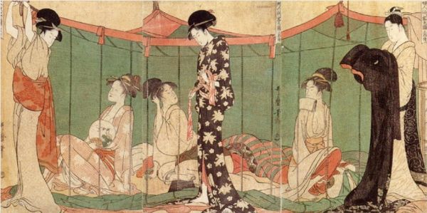Curator: Here we have Kitagawa Utamaro's "Housecleaning (Susuhaki)," a woodblock print from the Late Edo period. The print on paper is relatively small, about 37 by 24 centimeters. Editor: My first impression is one of domestic tension, a power dynamic at play. The slumped figure contrasts sharply with the upright women. Curator: The women are tidying up, but it's more than mere cleaning. The prone figure, seemingly a samurai, is being symbolically purged of his status and authority within this domestic space. Editor: Notice the deliberate arrangement of figures and the patterns—the women's kimonos, the dragon on the screen. The image vibrates with cultural symbolism, but also depicts a moment of social disruption. Curator: Indeed, the dragon screen suggests authority while the women challenge the conventional hierarchy, reminding us that homes were sites of social negotiation. Editor: This challenges our modern expectations of gender roles in feudal Japan and speaks to a deeper narrative of agency and resistance. I find this scene particularly compelling. Curator: It’s a quiet subversion, rendered in beautiful detail. We are left to interpret this disruption, connecting the past with our own understanding of societal power structures.