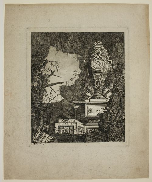 Editor: Here we have "Architectuurfantasie, blad 8" or "Architectural Fantasy, Sheet 8," an engraving by Jean Laurent Legeay from around 1767. It's an interesting composition, with a very classical urn dominating the foreground and figures that recede into the distance. How would you interpret this work? Curator: Immediately, I see the powerful tension between decay and aspiration. The urn, so meticulously detailed, suggests a longing for a classical past, a golden age of order and reason. But surrounding it, the almost gothic darkness and the suggestion of ruins whispers of the inevitable decline, the cyclical nature of empires. What cultural memories are evoked by such objects? Editor: I hadn't thought of it as ruins, just kind of a wild landscape. So you're saying the artist is using these recognizable classical forms to remind us of historical cycles? Curator: Precisely. Look at the way the light catches the urn versus the way it's almost swallowed by the encroaching wilderness. Light is a powerful tool, often used to express what survives, to signal meaning. Are those distant figures travelers or ghosts? Legeay understood how architectural forms embed cultural values, making these ‘fantasies’ vehicles for expressing complex societal anxieties. The wild and the urn are constantly confronting each other. Editor: So, it's more than just a pretty picture; it’s like a meditation on time and civilization itself? Curator: Yes! He's invoking an entire cultural narrative about rise and fall. Even the medium – print – suggests mass dissemination of these ideas. We could view this work through the lens of the Enlightenment, observing a society grappling with its own sense of history and destiny. Editor: That really changes how I see it. Thanks for pointing out all those layers! Curator: It's fascinating how an image, carefully constructed with familiar symbols, can carry so much emotional and historical weight. I now will see that architectural fantasy with different eyes!