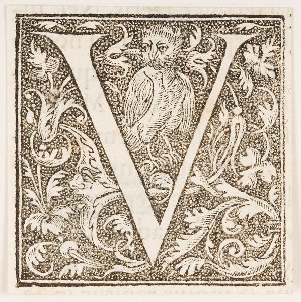 Curator: Here we have "Letter V," a fascinating example of anonymous printmaking housed here at the Harvard Art Museums. Editor: You know, the first thing that strikes me is its intricate, almost claustrophobic design... like a secret garden contained within this letter. Curator: Right, the vegetal motifs intertwining with the letterform invite a discussion about the relationship between text and nature, reflecting perhaps a broader societal engagement with botanical studies. Editor: It feels like a collision of worlds, the rigidity of language blooming into organic shapes. I wonder, was this meant to be part of a larger text, a kind of rebellion in illumination? Curator: It's very possible. In the context of early printmaking, the embellishment of initial letters often symbolized a yearning for pre-printing aesthetics, especially within religious and philosophical texts. Editor: Ultimately, for me, it is an evocative piece—a reminder that even the most functional components can hold beauty and rebellion. Curator: Indeed, seeing it through that lens allows us to rethink the legacy of printmaking and how even the smallest gesture can carry significant cultural weight.