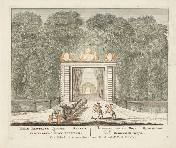 This print of the entrance gate to Huis ter Nieuburch in Rijswijk was made by Pieter Schenk, around the turn of the 18th century. It’s an etching, a process that involves biting lines into a metal plate with acid, inking it, and running it through a press. The etched lines are clearly visible, especially in the trees, which have a feathery quality, and in the woven curtains that frame the view into the estate. Look closely, and you’ll see that these lines are not mechanically uniform, but rather responsive to the artist’s hand. The etching process allowed Schenk to translate the grandeur of this estate – carriage approaching at speed – into a medium that could be widely reproduced and distributed. Prints like this one played an important role in promoting the image of wealthy landowners, showcasing their status in a way that was both artistic and commercial. It’s a reminder that even seemingly simple images are the product of skilled labor, material processes, and social context.