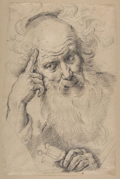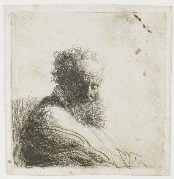 Jan Lievens made this etching of an old man's head using metal and acid. Lievens scratched the image into a waxy coating on a metal plate, then bathed the plate in acid. The acid bit into the exposed metal, creating lines that would hold ink. The material qualities of metal and acid define the image. The etching process allowed Lievens to create fine, detailed lines, ideal for capturing the texture of the man’s hair and beard, and the wrinkles of his face. The controlled corrosion of the metal by the acid gave the print its unique character, a contrast between light and shadow. Prints like this were relatively inexpensive to produce and distribute, making art more accessible to a wider audience. The print's existence speaks to a shift in artistic production, where reproducibility allowed art to circulate beyond the elite. Understanding the materials, and processes employed, allows us to appreciate the democratizing potential inherent in printmaking.