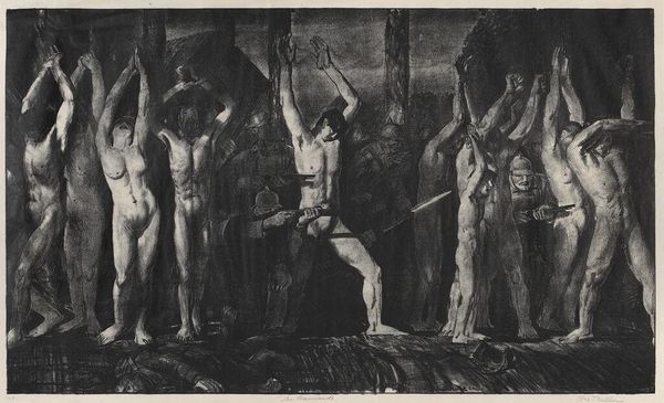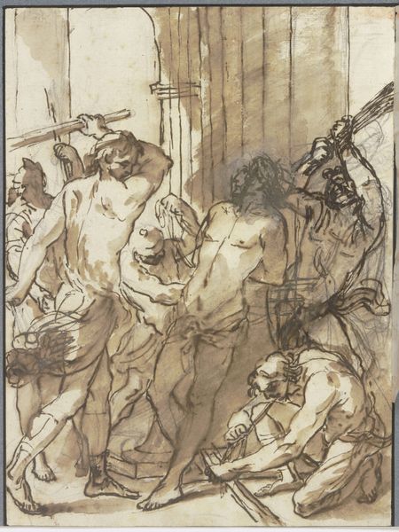 Curator: This striking oil painting is Jacopo Tintoretto's "Martyrdom of Saint Peter," created around the 16th century. The composition seems unsettling, even chaotic, at first glance. Editor: Unsettling is the right word. I am immediately struck by the disturbing tension: the upturned figure of the saint against the efforts of the executioners straining to secure him upside down to the cross. There's something viscerally jarring about the implied movement. Curator: The inversion is crucial. Saint Peter, traditionally seen as the first Pope, requested to be crucified upside down, not feeling worthy to die in the same manner as Christ. Thus, his positioning here isn't simply for dramatic effect, it is rich in symbolism and conveys humility even in his final moments. Editor: Absolutely, but it also represents a radical disruption of the conventional, perhaps a toppling of the established order, seen from a psychological lens. Tintoretto underscores that upheaval with his bold brushwork, particularly in the way he renders the musculature of the executioners. They seem almost frantic in their efforts, wouldn't you agree? Curator: Yes, the dynamism is palpable, achieved in part through the stark contrasts of light and shadow. Observe how the highlights seem to gleam from the figures, emphasizing their physical exertion, but also drawing the eye to Peter's serene, almost beatific, face. It's a brilliant use of tenebrism to heighten the emotional intensity. Editor: Indeed. Consider the ropes and chains binding St. Peter, those chains of office themselves, so to speak, also suggesting bonds of spiritual leadership and sacrifice that, for centuries to come, his successors will symbolically, if not literally, shoulder. Even the looming figure above with the placid expression participates in that loaded symbolic landscape. Curator: She could represent the detached and impersonal presence of authority… it serves as a reminder of the narrative's socio-political dimensions within its religious significance. Now that you mention it, those muted yet fiery, earthy tones that Tintoretto deployed also play a significant role in the composition. It feels grounded in physicality yet reaching toward transcendence. Editor: That visual and allegorical tension creates a viewing experience that lingers long after one has moved on. Tintoretto delivers an image with great physical power while quietly, reverently framing a supreme act of belief.