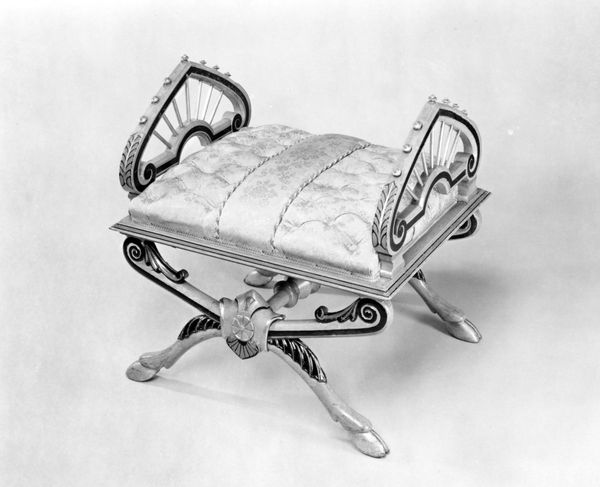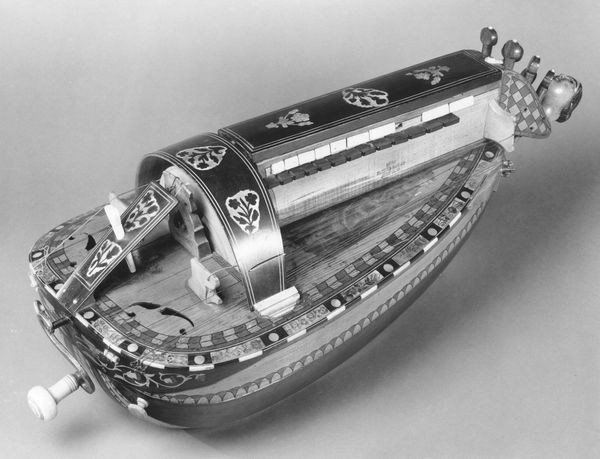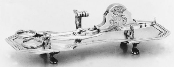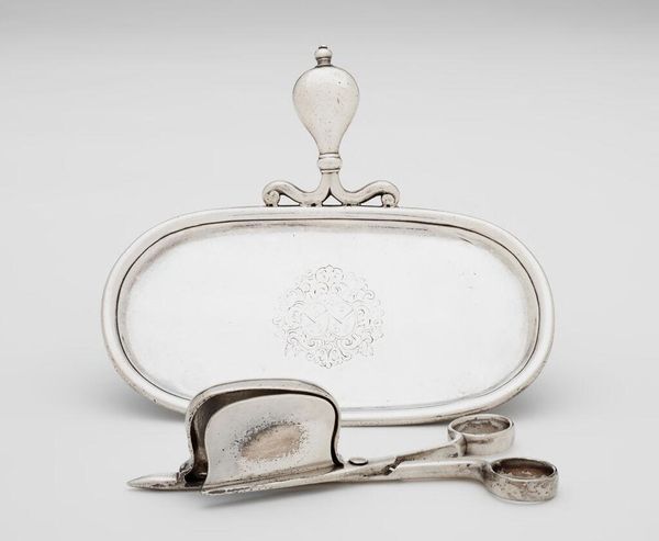 This is a silver snuffers tray with snuffers, made by Paul de Lamerie. It is adorned with motifs like shells and floral patterns, commonly associated with elegance and luxury during the 18th century. The acanthus leaves and shell patterns recall classical antiquity, symbols frequently revived during the Renaissance to signal a return to the perceived cultural heights of ancient Greece and Rome. This visual language evokes a sense of prestige. Note how these motifs are not merely decorative; they act as carriers of cultural memory. Consider the shell, for instance. It appears in Botticelli’s "Birth of Venus," symbolizing fertility and divine love. Here, on a humble snuffers tray, the shell echoes those grander themes, scaled down to domestic intimacy. This continuous return and adaptation of classical motifs illustrate the Nachleben, the afterlife of images. The very act of snuff-taking becomes elevated, imbued with echoes of mythological grandeur. In our collective psyche, these recurring symbols tap into primal human experiences, engaging viewers on a deep, subconscious level with enduring emotional and cultural power.