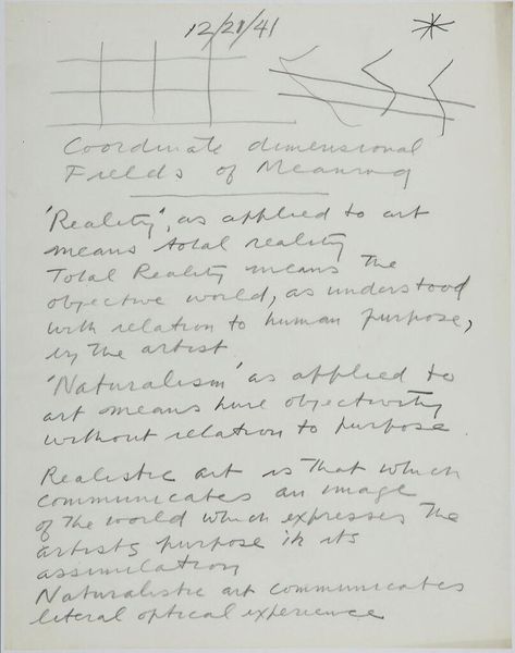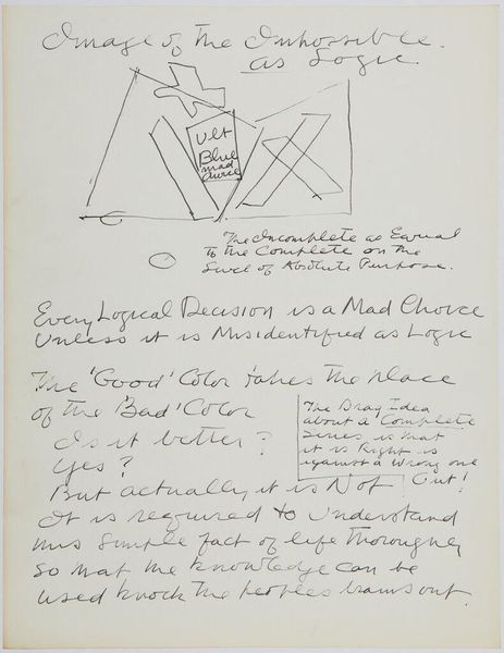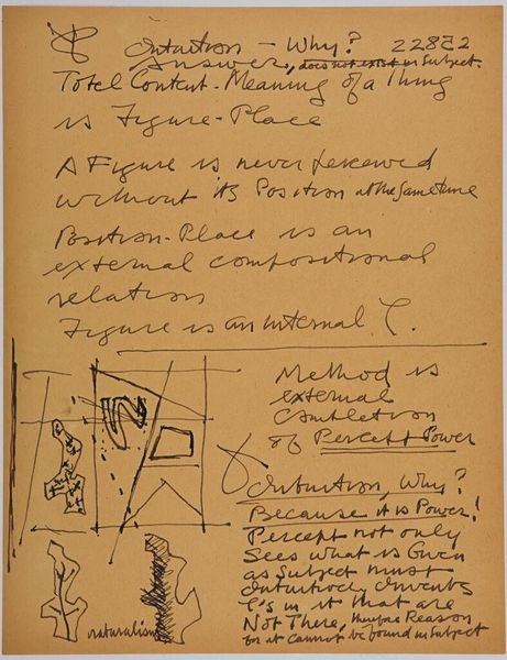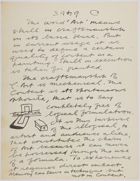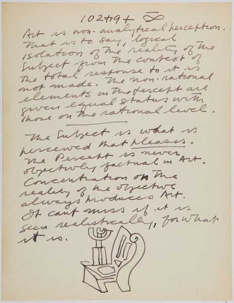 Editor: Here we have Stuart Davis' "Art Theory Text with Sketch." It looks like a page from a notebook, filled with handwritten thoughts and a small abstract drawing. What stands out to me is the contrast between the density of the text and the simplicity of the sketch. What do you see in this piece? Curator: I see Davis grappling with the role of art in society. The text suggests a rejection of conventional interpretations, emphasizing individual experience over imposed meaning. Consider the context: Davis was working in a period of great social change, and his art often reflected a desire to break from tradition. Editor: So, the "Universal Design" he mentions isn't about a specific style, but more about open interpretation? Curator: Precisely. It speaks to the democratization of art, challenging the idea of a singular, "correct" understanding dictated by critics or institutions. Editor: That gives me a lot to think about. It's like he's inviting the viewer to participate in the creation of meaning. Curator: Exactly! The sketch serves as a visual prompt, not a definitive statement.