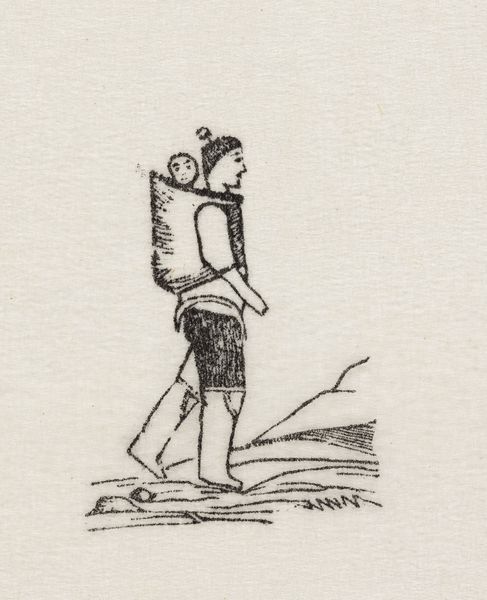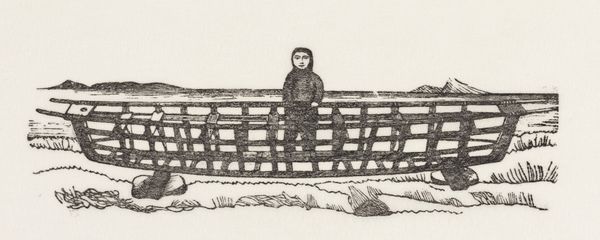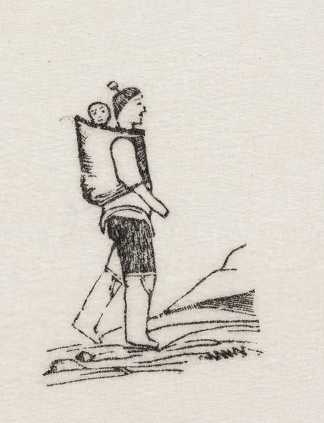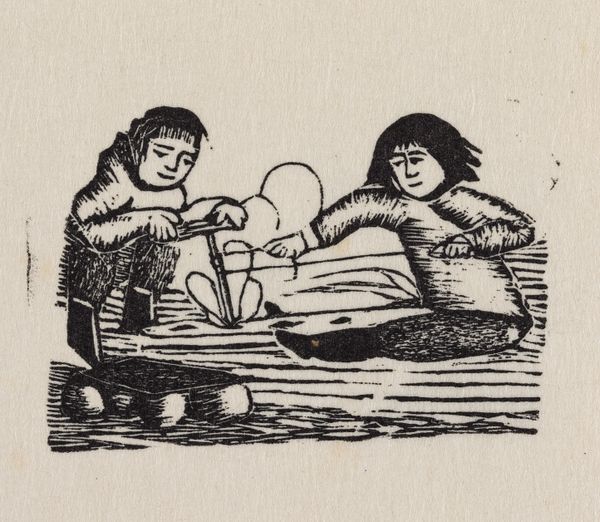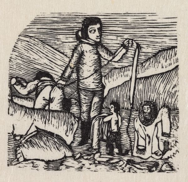 This small print, "To mænd og et krybende væsen uden for en vinterbolig. Sagnmotiv?" by an artist named Abraham, was made using a wood engraving technique. The image shows a scene with two figures and a crawling creature outside a winter dwelling. The process of wood engraving involves using very fine tools to carve an image into the end grain of a block of wood, creating a surface that can then be inked and printed. This method allows for intricate details and fine lines, as you can see in the texture of the figures’ clothing and the rendering of the snow. The stark contrast and the graphic quality of the print result from the directness of the carving process, where each line is a deliberate mark. Though this was a reproductive technique, used to make images for mass consumption, one can still feel the hand of the artist as they carefully incised the block. Ultimately, understanding this print means appreciating the labor and skill involved in its making, revealing the relationship between artistic expression and the broader context of production.