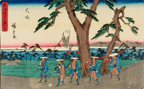 Curator: Utagawa Hiroshige, born in 1797, captured a moment along the Tokaido Road in his print, "TOKAIDO (MARUSEI) HAMAMATSU, STATION 30," now residing at the Harvard Art Museums. Editor: Immediately, I'm struck by how melancholy the scene is, despite the vibrant blues of the water. It feels like a sigh. Curator: Indeed. This work offers insight into the lives of travelers and laborers along this crucial route, reflecting socio-economic dynamics of the era. Editor: Those stooped figures, carrying what looks like a giant green puffball! It’s almost humorous against the vastness of the sky and sea. I'm curious about their story. Curator: It speaks to the resilience of the working class against the backdrop of shifting landscapes, embodying themes of endurance and social inequality. Editor: It's a poignant slice of life, and strangely beautiful in its quiet, slightly windswept way. Curator: Seeing this through your eyes reminds us of the importance of empathy when engaging with works of the past. Editor: And for me, it highlights the power of art to reveal unexpected beauty, even in the everyday struggles of life.