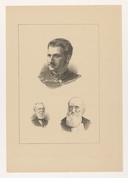 Editor: Here we have a print called "Drie portretten van Alexander II, H.P. Pelham-Clinton, George I," dating from 1842 to 1898, here at the Rijksmuseum. It depicts three portraits, one above the other, and what immediately strikes me is how they each seem to represent a different generation, even a different approach to portraiture. What are your initial thoughts when looking at this piece? Curator: Well, considering it’s a print, likely an engraving, we have to think about the labor involved in its production. The transfer of these likenesses from, presumably, paintings or photographs onto a matrix by a skilled artisan. Each line meticulously etched, translating light and shadow. It begs the question, what was the social function of distributing these images in this way? Who consumed them, and why? Editor: That's interesting. I hadn't considered the act of reproduction itself as part of the meaning. So, it’s less about who these men are, but rather what the mass production of their image represents? Curator: Exactly. The materials themselves are key. Cheap paper, readily available, would allow for wider distribution, democratizing the image in a way that an oil painting wouldn't. But it also begs the question of originality, doesn't it? Is this an artwork in its own right, or simply a vessel? What do you think? Editor: I guess it blurs those boundaries. It's reproducible, but the skill involved in the engraving elevates it beyond a simple copy. It also speaks to the power and reach of printmaking during that period. I definitely see that a materialist approach highlights those considerations, almost challenging the idea of the 'aura' surrounding traditional portraiture. Curator: Precisely. And isn't it interesting how shifting our focus onto production allows us to reconsider hierarchies within the art world itself? From high art to the skilled craft of the engraver. Editor: It’s like rediscovering the layers of labour behind a seemingly simple image. Thanks, I am seeing that so much clearer now. Curator: My pleasure, looking at the piece's construction materials and methods broadens one's outlook so profoundly!