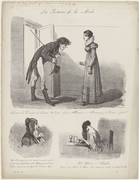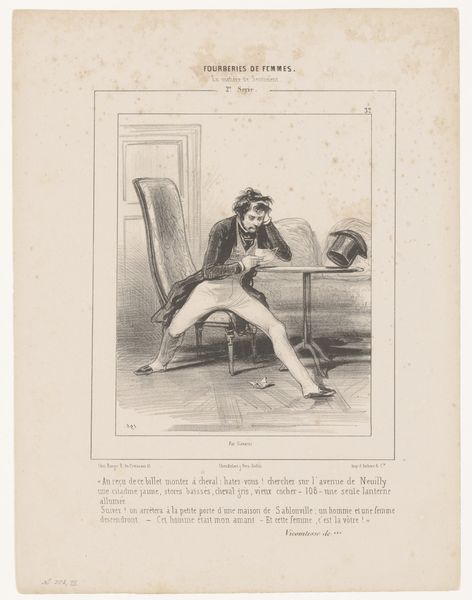 Curator: Paul Gavarni's drawing, "Why deprive oneself of the superfluous...", presents us with a dandy putting on his boots. Editor: My first impression is one of early morning struggles, perhaps? There’s a hint of satire in the air, a commentary on vanity. Curator: Absolutely, the context is crucial. Gavarni captured the burgeoning consumer culture in Paris; the rise of fashion and its impact on social identity. Editor: Note the tools of the trade scattered around—the bootjack, the brush. These are not just items; they’re symbols of labor, even in the pursuit of leisure. Curator: And consider that the phrase in the title ends with the comparison "as a woman who rents one or two opera boxes." Editor: Ah! So there's a sharp critique of materialism and social climbing embedded in this seemingly simple scene. It still resonates today. Curator: Indeed. Gavarni makes us consider what we consider "necessary" versus what society tells us we need. Editor: The materiality of class laid bare in a drawing, clever!