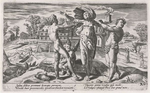 Curator: Look at this engraving, "De baljuw probeert de koe van de boer te kopen" by Bartholomeus Willemsz. Dolendo, dating back to 1613. It's currently housed in the Rijksmuseum. Editor: It’s… well, visually busy. Lots of characters crammed in. The stark contrast and fine lines of the engraving emphasize a kind of raw energy, almost frantic. There’s something unsettling about the scene. Curator: Absolutely. As a print, an engraving, its creation inherently involved a complex network of production. Dolendo, though his name is attached, likely worked within a larger workshop system. This print then circulated, becoming a commodity itself. Think about who had access to these images. What did its widespread availability signify about Dutch society? Editor: So you're placing it within the context of its material conditions. I see it primarily as a stage for a certain drama. Look at the composition. The baljuw, that imposing figure in the feathered hat, occupies the right, with his gesturing hand pulling us in. Then the farmer, on the left, recoils, desperately holding a container over his shoulder. The light focuses sharply on them, staging the moment of confrontation. The cow relegated further back— it is, literally and figuratively, secondary. Curator: Right. And consider how the labor involved in agriculture, in maintaining livestock, gets flattened here. The print highlights the sheriff’s attempt to extract wealth, representing power dynamics and economic realities of the time. Engravings were often moralizing; this speaks to broader discussions of social justice. Editor: I appreciate that contextualization. For me though, it comes down to visual rhetoric. Notice how Dolendo uses cross-hatching to model the figures’ forms. The baljuw and his lackeys contrast sharply against the farmer and his family, in both dress and demeanor. Dolendo employs specific artistic conventions to highlight injustice through form. Curator: It shows how art wasn't this rarefied "creation ex nihilo," but intertwined with craft, social relations, the economics of art. Who produced the paper, the ink? What skills did the engraver need? Editor: Perhaps both. The power lies in the image, its forms capable of sparking debate—visual tools revealing historical dynamics that endure beyond their creation.