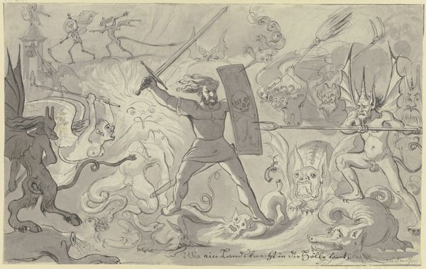 Here is the audio guide script: John Flaxman created this illustration to the Iliad, rendered in delicate lines and a stark, classical style. The composition is strikingly symmetrical: Jupiter sits enthroned in the center, flanked by an eagle and a figure representing a pernicious dream. The clean, sparse lines give a sense of austere grandeur, reminiscent of ancient Greek friezes. Flaxman uses line to define form and convey depth, with subtle gradations suggesting the contours of Jupiter's figure and the surrounding celestial space. The minimal shading further emphasizes the linear quality, reducing the scene to its essential forms. This emphasis on line and form reflects Flaxman's neoclassical sensibilities, seeking to distill the epic narrative into its purest visual expression. In doing so, the illustration invites us to consider the structural elements of storytelling and representation. It prompts us to contemplate how an artist can convey complex narratives through minimal means, relying on the power of suggestion and the viewer's own imagination to complete the picture.
