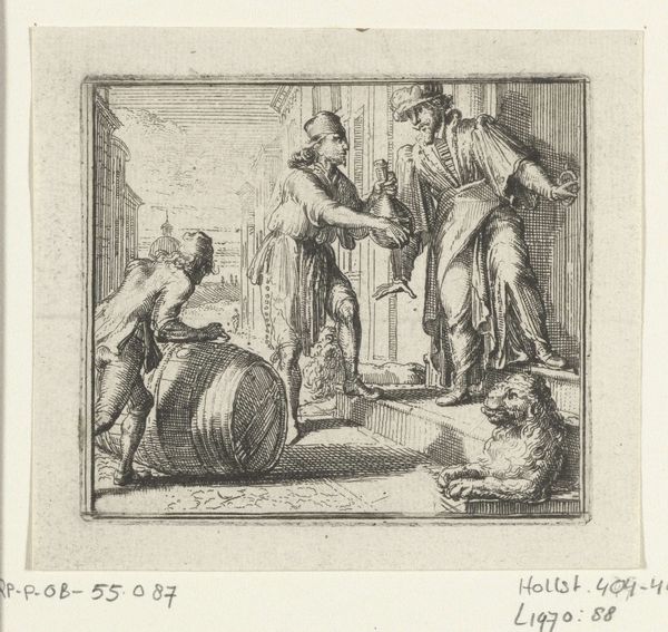 Editor: Wallerant Vaillant’s etching, "Vioolspeler in een herberg," or "Violin Player in a Tavern," made sometime between 1658 and 1677, really gives me the feeling of being in a smoky, boisterous Dutch tavern. It’s captivating. What strikes you most about this scene? Curator: Well, given my perspective, I'm immediately drawn to the socio-economic context hinted at by the materiality of the image itself. An etching is, after all, a reproduction. Consider the labour involved in its creation: the skilled artisan replicating an image, making it accessible to a wider audience than an original painting. Editor: So, you're saying that the medium itself is significant? Curator: Precisely. It speaks to a burgeoning market for art accessible to the merchant class, not just the aristocracy. Look at the scene: a musician, presumably playing for a living, surrounded by others drinking. This isn't idealized portraiture, it's a slice of everyday life. Editor: I see what you mean. The choice of printmaking opens it up to everyday consumption. The details in the clothing of the figures might speak to something as well? Curator: Absolutely! Notice the worn fabrics, the simple garments. What does that say about their place in Dutch society during its Golden Age? It’s a depiction of labour and leisure intertwined, manufactured for a market eager to see themselves reflected, or perhaps titillated by a glimpse into a different social stratum. How does considering that impact your initial sense of the image? Editor: It adds a layer of complexity that I hadn't fully considered. It’s not just about the tavern scene, but also about Vaillant making art accessible to others. Curator: Exactly! It brings the whole piece, and its cultural significance, to life.