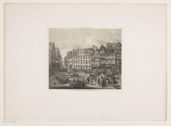 Johann Kaspar Eissenhardt created this print depicting Frankfurt's Liebfrauenberg. This bustling marketplace, framed by timbered buildings, offers a glimpse into the everyday life of 19th-century Frankfurt. Central to the composition is the gathering of people, a motif echoed throughout art history. These figures, engaged in commerce and conversation, recall similar scenes found in Renaissance paintings and even ancient Roman frescoes, each capturing the vibrant energy of communal life. The timbered architecture, a distinctly Germanic symbol, evokes a sense of tradition and stability. This architectural style appears in varying forms across Europe, reflecting regional adaptations and cultural exchanges, yet it always carries a sense of rootedness. Consider how such communal scenes tap into our collective memory, triggering an emotional response tied to our inherent need for social connection and belonging. The image's emotional power lies in its capacity to resonate with our shared human experiences, reminding us of the enduring importance of community. This image, therefore, isn't just a snapshot of a place; it’s a mirror reflecting our continuous social impulses through time.