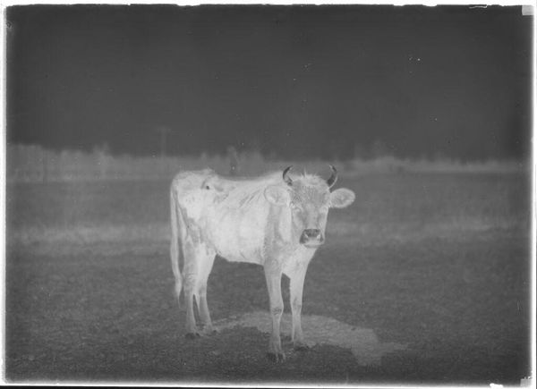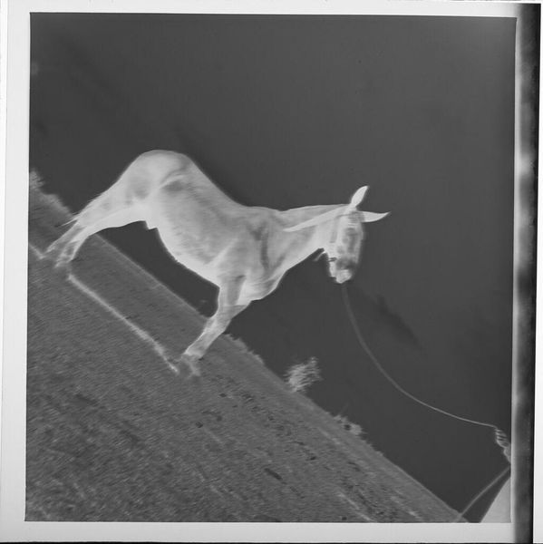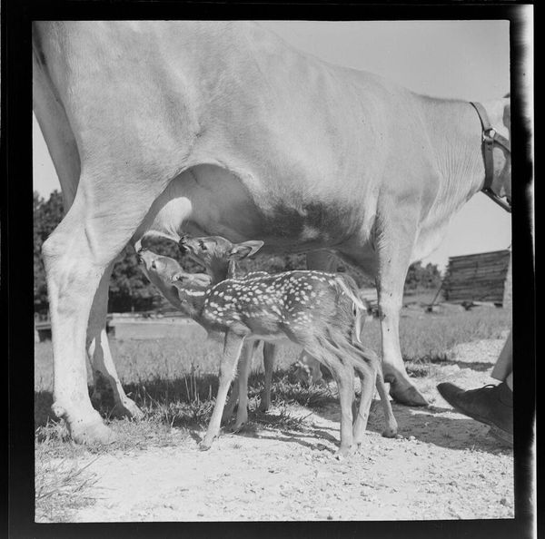 Editor: This photograph, "Untitled (baby fawns and cow)" by Jack Gould, shows a cow seemingly interacting with fawns. It’s a striking image, but I'm not sure what to make of it. What do you see in this piece? Curator: This image, especially given its inverted tonality, can be interpreted as a commentary on imposed hierarchies and our relationship to nature, particularly within capitalist structures. Consider the cow, a symbol of domestication and agricultural exploitation, juxtaposed with the wildness of the fawns. What does their interaction suggest about the boundaries we create between the natural and the artificial? Editor: That’s a perspective I hadn't considered. It reframes my understanding of it. Curator: Exactly. And it reminds us to question the power dynamics inherent in how we perceive and interact with the animal kingdom. Editor: I'll definitely be thinking about this piece differently now! Curator: Me too!