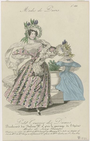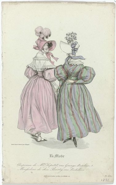 Curator: Let’s examine “La Mode, 1831, Pl. 147, T.2,” a watercolor print by Jean-Denis Nargeot. It epitomizes Romantic era aesthetics through its depiction of current fashion trends. Editor: My first impression? Restrained yet opulent. The pastel palette feels very delicate, almost ephemeral. I notice the extravagant puffed sleeves and the elaborate hat—they certainly convey a sense of privileged femininity. Curator: Precisely. The materials are meticulously rendered—the weave of the shawl, the texture of the straw hat, and the subtle sheen of the umbrella. These details reflect the burgeoning textile industry and consumer culture of the time. Fashion became increasingly accessible due to industrial innovations and new modes of production. Editor: Absolutely. And it's essential to consider the social context of such imagery. These fashion plates served as tools of aspiration and distinction. They highlighted not only clothing, but a performance of class and gender. Look at the two men in the background—their attire subtly signals a different sphere of power and mobility. Curator: I’m also thinking about the skilled labor that went into creating both the fashions depicted and the print itself. The process from designer to artisan to consumer involved a complex network of often overlooked workers. Where was the fabric for the dress manufactured, under what conditions? Editor: We also have to think about the societal expectations these images reinforce. The emphasis on beauty, refinement, and the latest trends could be both empowering and constricting for women navigating their roles within the shifting social and economic landscape of the 19th century. This illustration, therefore, presents a very narrow image of femininity and aspiration. Curator: A fair point, but examining the printmaking process is just as crucial. The techniques, the inks used, the division of labor in creating these plates all provide vital clues about the period's industrial capabilities. Editor: Understanding this artwork calls for a more intersectional interpretation that examines its social and gendered implications in parallel with the process of production itself. Only by bridging these elements, can we hope to fully unpack the many layers of meaning imbedded in "La Mode." Curator: By viewing “La Mode” as a visual artifact shaped by the social forces and the material conditions of its time, it presents fresh avenues to reassess 19th century industrialization and culture. Editor: This print allows us to ask critical questions about representation, labor, and aspiration and thus connects historical images like these to current discussions about labor conditions and self-presentation in fashion and culture.