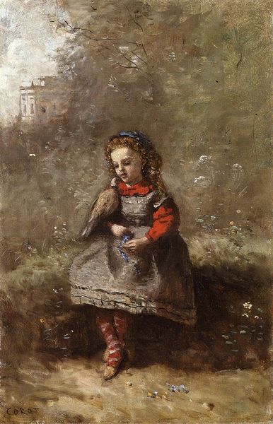 Curator: Today we're considering "Pensive Young Woman," an 1870 oil on canvas by Camille Corot. It currently resides in a private collection. Editor: My initial reaction is to the melancholic tone. The girl's downcast gaze, combined with the muted palette, creates a strong sense of introspection and perhaps a hint of sadness. Curator: Corot, although sometimes described as an Impressionist, maintained a foot in the Barbizon school's representational ethos while influencing the coming generation of painters. The fact that we encounter her during a period of vast social changes in France interests me most; the construction of gender, labor, and class were changing so drastically for women like her. Editor: The composition draws me in—a visual rhythm with the dark skirt balanced against the lighter tones of the background. Note how the texture varies: soft focus landscape against clearly articulated hands. How do you feel the stylistic treatment contributes to meaning? Curator: Exactly. While artifice has value in that meaning making, what does it mean when coupled with ideas of labor? It offers insight into the daily lives and psychological states of working-class women in 19th-century France. We must ask ourselves, how might her dress and the rural environment signal a commentary on tradition and modernity? Editor: I see your point. By subtly manipulating color relationships and compositional organization, the artist invites the viewer into a certain emotional space, a contemplative state. We can both consider the sociohistorical dimensions while analyzing artistic strategies. Curator: And ultimately, engaging with this image is an exercise in how artworks both reveal and conceal aspects of individual and collective experience across various divides of gender, class, and time. Editor: I’m left appreciating how Corot encourages a sustained visual encounter, and how his strategic deployments of color and tone contribute to this artwork's poignant mood.