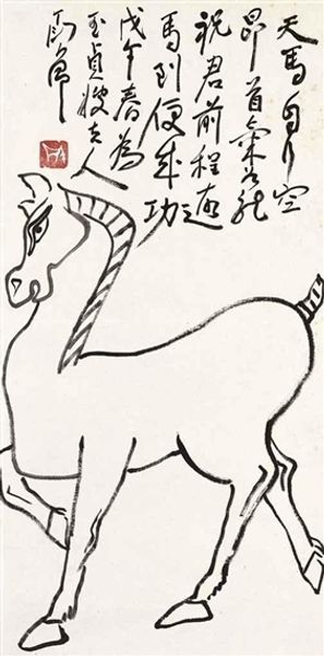 Curator: Ding Yanyong's 1978 drawing, "Lion Dance," crafted with ink on paper, presents us with an intriguing piece. What strikes you first about it? Editor: It has this almost naive, child-like quality in its execution. The lines are simple, bordering on crude, but there's also something undeniably joyful about it. A sense of playfulness perhaps. Curator: Precisely! Note the deliberate economy of line, almost calligraphic. Yanyong’s style often integrated traditional Chinese ink painting techniques with a more modern, expressive approach. The flat planes of color and bold outlines contribute to a simplified visual language. Editor: Yet it feels deliberately distanced from the actual cultural weight of the Lion Dance, doesn’t it? The performers seem burdened, almost caricatured, and the lion itself looks rather absurd with its bulging eyes. Could this be read as a commentary on the performance of tradition in a changing society? Curator: An interesting interpretation. Formally, the composition focuses on the contrast between the geometric shapes forming the lion and the more fluid, organic lines of the human figures. The limited palette also forces us to concentrate on these shapes and lines and, yes, even that comical face. Editor: The caricature lends itself to considering post-colonial identities. Was Yanyong maybe poking fun at how these traditions were becoming commodified or seen as outdated? Curator: It's definitely a valid point to explore those potential social narratives woven into the artwork. By reducing the figures and lion to their most essential forms, it pushes viewers to deconstruct and engage with the foundational symbols of the dance. It makes us reconsider their meaning. Editor: It makes you wonder what aspects of that shifting landscape the artist was interested in challenging. The work as an artifact really reflects its time and place, not just culturally but in broader terms. Curator: Exactly. Focusing on formal elements allows a space for interpreting those narratives while seeing the composition for its basic structural beauty. Editor: Agreed. “Lion Dance”, beyond its immediately arresting visual qualities, holds within it complexities that speak volumes to identity, history, and the often-challenging dynamics of culture.