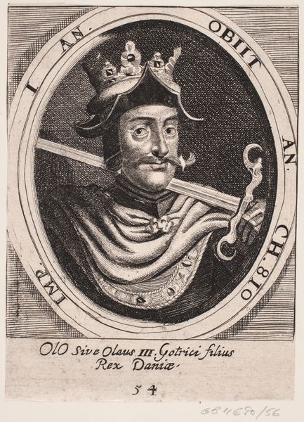 Curator: This is a 1646 print titled "Kong Oluf III," created by an anonymous artist. The medium is engraving. It's held here at the SMK, Statens Museum for Kunst. Editor: The figure projects an aura of austere authority, but the somewhat crude, almost shaky linework gives it an earthy quality too. It's clearly meant to be stately, but somehow feels folk-ish to my eye. Curator: Consider the social context. Prints at this time functioned as relatively affordable, reproducible images, making portraits like these more accessible than painted versions for, say, the rising merchant class or provincial gentry. So while Oluf might be depicted as powerful and divine through conventional iconography, it’s being disseminated through an emergent, almost industrial, image culture. Editor: Right, the crown, the sword, the scepter – those are the explicit symbols of power. But the oval framing and inscriptions create a kind of numismatic quality, turning Oluf into a coin-like icon. Note the inscription mentioning his death anno 810—casting the king's image as historical, mythic even. It adds layers of complexity. Curator: Absolutely. And how that historical memory gets packaged for consumption. Engravings like this involved workshops, distribution networks, and a whole economy of production—paper, ink, the engraver's labor, and ultimately its reception by a broad public audience, something absent in an oil painting, for instance. Editor: There's almost a flattening of historical depth, compressing layers of meaning into something immediately recognizable, even timeless. This is more than just a portrait. It aims to fix a figure and ideal for posterity using a few well-chosen, instantly recognizable symbolic keys. Curator: The tension between the hand-made, laborious process of engraving and the intended aura of regal permanence makes this particularly interesting to me. It is a great example of production and reproduction in early modern portraiture. Editor: A fascinating image to untangle; a perfect dance of visual echoes through the corridors of cultural memory, transformed via the printing press. Curator: Indeed; a striking lens through which to consider the making and meaning of power.