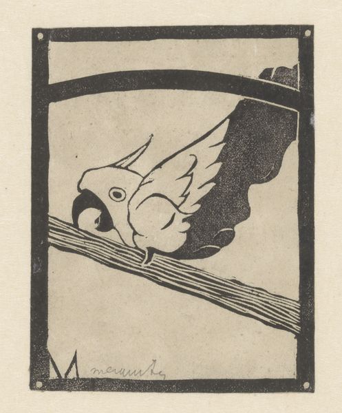 Curator: Let’s turn our attention to Samuel Jessurun de Mesquita’s striking linocut from around 1899, titled "Profile with Hat and Mask." Editor: There's a powerful starkness here, isn’t there? The heavy lines create this immediate sense of theatrical darkness—almost like a commentary on identity through constructed performance. Curator: Exactly. De Mesquita’s choice of linocut is so crucial; it facilitated bold forms and dramatic contrast. We should remember that graphic arts were experiencing a revival at the turn of the century. Woodcuts and linocuts were embraced as democratic mediums, pushing art beyond elite circles to a broader public, influenced by Japonisme, offering avenues for social commentary. Editor: Masking, particularly within contexts such as Carnival or masquerade balls which served not only celebratory but at times subversive purposes. I see an intriguing exploration of secrecy, visibility, and power dynamics – especially within the socio-political landscape of the period. Is it commentary on the facade that society expects us to perform? Curator: Possibly. Mesquita utilized this reductionist, graphic vocabulary to construct an image reflecting the societal shifts toward symbolism and self-expression. The materiality allows for infinite reproductions – making it easily distributable and allowing for broader reception of these ideals of freedom, questioning social expectations and challenging the established hierarchy of traditional portraiture. Editor: Thinking about it as caricature broadens that critique even further, almost skewering the idea of bourgeois self-portraiture. And I wonder too about the gendered element – what societal expectations is this figure subject to, and what does masking allow for them? Curator: Those are important avenues for consideration. By focusing on printmaking and the symbolism style, de Mesquita engages the production, reception, and contextual elements beyond solely pictorial representation. Editor: Agreed. Viewing the work today highlights the enduring relevance of discussions around performativity and socio-political expectations. Curator: Indeed, and it is that emphasis on both making and societal reflection that keeps it powerfully relevant.