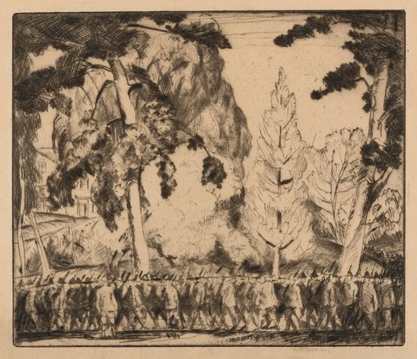Editor: Here we have Anna Ostroumova-Lebedeva's "Round Pond," made in 1923. It's a linocut print, and I find the stark contrast between black and white so striking. What catches your eye in this work? Curator: As a materialist, I'm immediately drawn to the process itself. Look at the textures Ostroumova-Lebedeva achieved with a linocut—normally associated with craft rather than high art. The gouges and deliberate cuts into the linoleum, usually destined for utilitarian use, elevate the material to artistic expression. Editor: So, you're saying the inherent qualities of the linoleum itself contribute to the artwork’s meaning? Curator: Precisely. The labour is evident in every line. Mass production was transforming society and the availability of materials during that time influenced artistic practice, moving printmaking toward this accessible medium, it begs us to ask about democratization and access to art, which aligns with shifting social dynamics. Editor: I hadn’t considered that the choice of material speaks to broader accessibility in art making. It’s such a contrast to, say, oil painting in those days. Does the lack of color impact this aspect? Curator: Definitely. Limiting herself to black and white further emphasizes the material constraints and elevates technique to the foreground. Notice how the light becomes almost sculptural; what does this choice tell us about the accessibility of color and artistic tools at the time for the working class? It prompts a critical look at the relationship between artistic expression and economic conditions. Editor: I’m starting to appreciate this piece a lot more now. Considering the linocut as more than just a medium really opens up the avenues to talk about labour and the economics of art. Curator: Exactly. By interrogating the materials and the means of production, we unlock a deeper understanding of the artwork’s significance.