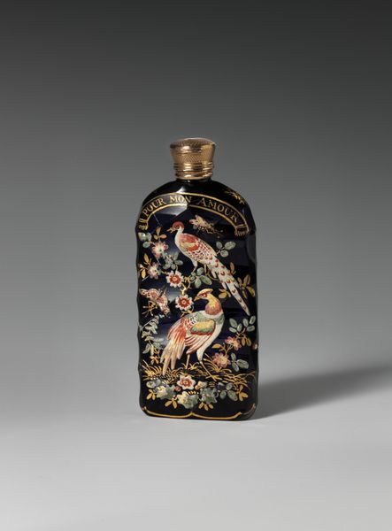 Curator: Welcome. Today we are observing a delightful flagon created between 1760 and 1770 by the Chelsea Porcelain Manufactory. You can find it here at the Metropolitan Museum of Art. Editor: My first thought is how intensely decorative it is, how it speaks to rococo aesthetics but, also, just makes me wonder what it held and for whom? The textures also looks like it would have had a nice weight to it in one's hand. Curator: The Chelsea Porcelain Manufactory was of course a major producer of luxury goods for the English elite. Flagons like this weren’t merely functional, but rather statements of wealth and status, particularly during a period of burgeoning global trade. Editor: Exactly. The level of skill embedded in the production! Look at the evenness of the porcelain and then all that detailed ornamentation, especially the gilding. Someone dedicated quite a bit of time and expertise to the creation of this flagon, not to mention what the people extracting raw materials must have gone through. Curator: Indeed. The figure in the central cartouche, seemingly a noble woman resting near a tree. Consider this too as not just about a pretty thing but also consider what sorts of ideals of beauty and leisure the piece puts on display. It seems quite staged and poised. Editor: And the social context of that imagery, too! This piece naturalizes the hierarchies that granted elites such leisure, all smoothed out and rendered innocuous on a porcelain surface. Though there’s always that tension when labor is used to produce commodities. Curator: Such production also involved the shaping of identity. Owning such pieces allowed individuals to position themselves within these hierarchies, to communicate messages about themselves. The piece seems designed for such communication. Editor: So true, from material sourcing to finished product, we’re looking at more than just a bottle here. We're looking at networks of human labour that spanned continents. Thinking about all of that— it really puts the supposed "delicacy" of porcelain into an entirely new, rather intense light. Curator: Precisely! And perhaps by understanding this material network, and the piece’s display of ideals and political power, we can develop a new vision for what role art can play. Editor: Here's to rethinking pretty things and the messy networks they bring to the surface.