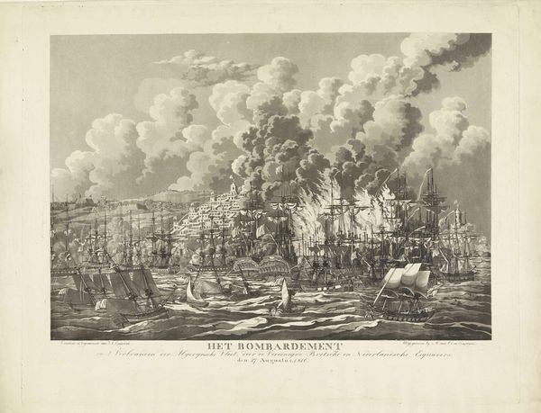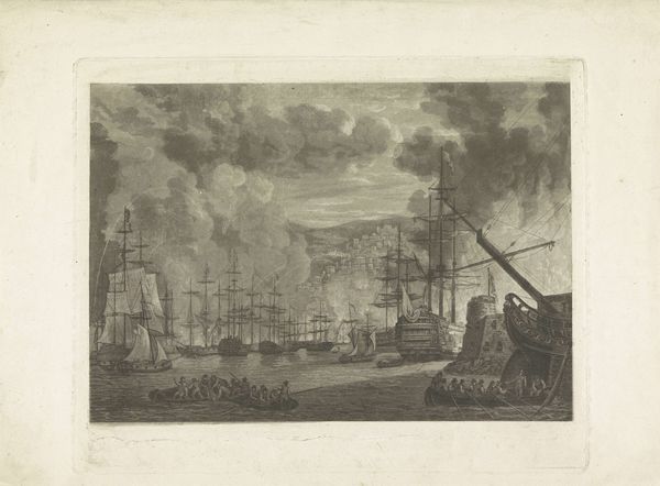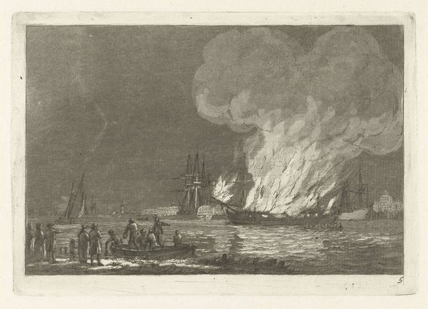 Curator: Well, hello there! This rather dramatic engraving before us is titled "Brand in 's Lands Zeemagazijn, 1791", or "Fire in the Naval Warehouse, 1791". It was created by an anonymous artist and depicts, as you might guess, quite a large fire! Editor: My first thought? Utter chaos frozen in time. It's amazing how this artist captured so much dynamism using static lines. The sky practically vibrates with the heat, even though it's all shades of grey! And all those little figures fleeing...it really conveys the raw energy of disaster. Curator: Absolutely. The composition really pulls you in, doesn't it? The stark contrast between the raging inferno and the fleeing crowds on the shore really captures the intensity of the event. Given the date, and the style here, we’re really seeing the transition into Romanticism. Editor: Indeed! Fire is, after all, one of those primal symbols: destruction, purification, chaos… the very thing that transforms. And in this print, you feel its insatiable appetite almost anthropomorphized in those swirling, ominous clouds. The figures along the harbor are, en masse, symbolic as well: each face anonymous and undifferentiated, and therefore representing any or every man or woman running from a similar disaster. Curator: That’s a good point, especially when you consider Amsterdam's reliance on the sea for trade and defense. The naval warehouse wasn't just a building; it was a symbol of their power and prosperity going up in smoke. So there is also that hint of commentary on perhaps fleeting material existence… Editor: Exactly! It’s a very poignant illustration of the Dutch Golden Age giving way. Visually, even the medium supports the message; an engraving offers a certain austere directness. It eschews embellishment and commits to documentarian urgency over painterly emotion. Curator: And though unsigned, the creator of this print did succeed in producing a surprisingly emotionally charged, dramatic historical record. The billowing smoke and hurried postures almost obscure how calm the water seems. It's quite affecting, when you consider what’s depicted here! Editor: Precisely. That strange visual calmness, in contrast with the implied heat of the raging fire and hurried chaos, really communicates how something can appear calm, yet be anything but. Food for thought in art and in life, I think!