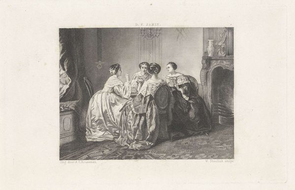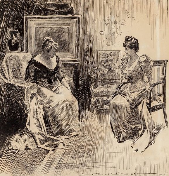 Charles Dana Gibson created this pen and ink drawing, A Social Gathering, at the turn of the 20th century. It depicts a scene of wealthy leisure, but it also subtly critiques the social dynamics of the American upper class. Gibson was known for his illustrations of the "Gibson Girl," a representation of the ideal American woman: tall, independent, and athletic. Here, we see several women who embody that ideal, engaged in conversation. The man in the background looks on, seemingly excluded. The setting is a lavish home with a painting of an aristocratic figure hung on the wall, perhaps suggesting a longing for old-world status in the new American elite. The drawing comments on the social stratification and gender roles of the time. By studying Gibson's illustrations in publications like *Life* magazine, along with historical accounts of upper-class social life, we can gain a deeper understanding of the cultural values and social tensions of the Gilded Age.
