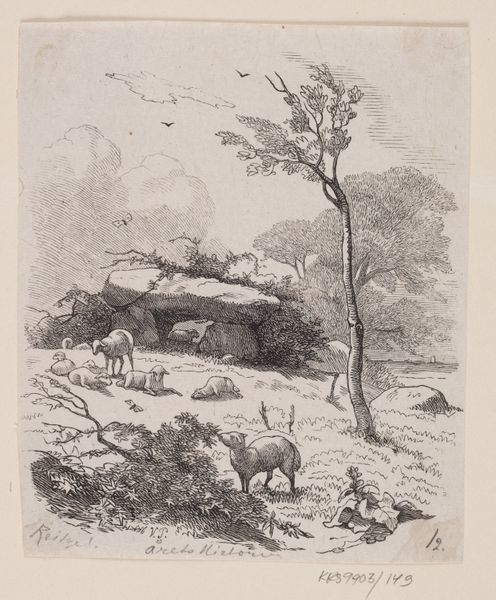 Editor: So this is Karl Bodmer's "Kudde bisons in de omgeving van Missouri," or "Herd of Bison Near Missouri," created in 1863. It’s an engraving and reminds me of illustrations you’d see in an old adventure novel. What stands out to you about this piece? Curator: As a historian, what immediately grabs my attention is the date, 1863. Think about what else was happening then: the American Civil War. This image, created during such a turbulent period, romanticizes the American West, portraying a landscape abundant with wildlife. It begs the question: for whom was this idyllic image created, and what purpose did it serve? Editor: That's interesting, I hadn't thought about that at all. Curator: This print also allows us to examine the role of images in shaping public perceptions. Consider how these images were circulated. Were they intended for scientific documentation, or were they aiming to attract settlers westward, regardless of the realities of westward expansion and its impact on Indigenous populations? Editor: I see what you mean. It’s like the image is participating in a bigger story about the West. How does the style fit into that? Curator: The artistic style— a very detailed realism typical of its time, with a touch of romanticism in the vast landscape—also influences how we perceive this scene. The picturesque rendering of the bison herd contributes to a narrative that downplays the environmental impact and human cost of westward movement. Editor: That definitely gives me a new perspective. It’s more than just a picture of bison; it’s part of a much larger historical and social narrative. Thanks! Curator: Indeed. By considering its historical context, we can better understand how art both reflects and shapes societal values and political agendas. There's always more than meets the eye.