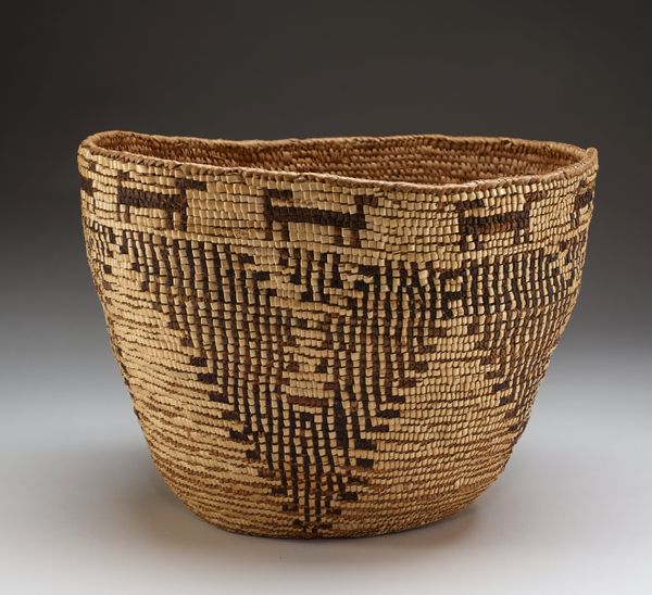 Editor: Here we have a beautiful coiled storage basket with a serrated-line design, made between 1880 and 1890 by an artist from the Pomo culture. It's a woven piece, and what really strikes me is its quiet strength. It feels both utilitarian and deeply personal. What do you see in this piece? Curator: For me, it's like holding a whisper of history, a story woven – quite literally! – into the very fibres. Look at the precision of that coiling, the careful repetition of those geometric patterns. Imagine the hands that created this, the patience, the artistry passed down through generations. It feels more than just a basket, doesn't it? Editor: Absolutely. I was reading a bit about Pomo basketry, and it said they were often used for ceremonial purposes too. Does that influence how you see the object? Curator: Definitely. Thinking about its possible use changes everything. Is it a simple storage vessel, or a sacred object? The zigzag designs could symbolize so much - lightning, mountains, the pathways of life. It reminds me of ancient songs and stories, still resonating in the object today. Editor: That’s fascinating. It makes you think about all the hidden meanings that might be there. Curator: Exactly! And consider the materials themselves - gathered from the land, each with its own spirit. There’s a dialogue happening between the artist, the environment, and the intended purpose. Editor: I love that – "a dialogue." It really reframes how I think about it. Thanks! Curator: My pleasure! And who knows, maybe its spirit will sing to you as well, just like this artifact is doing.