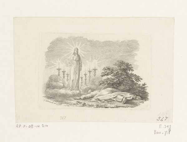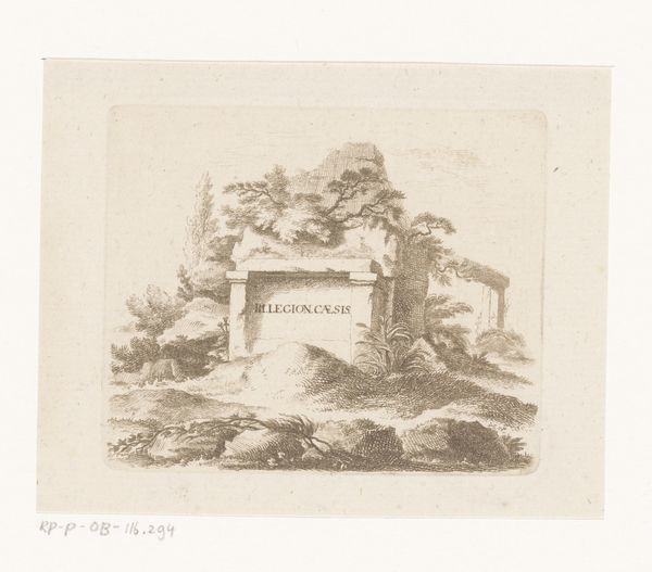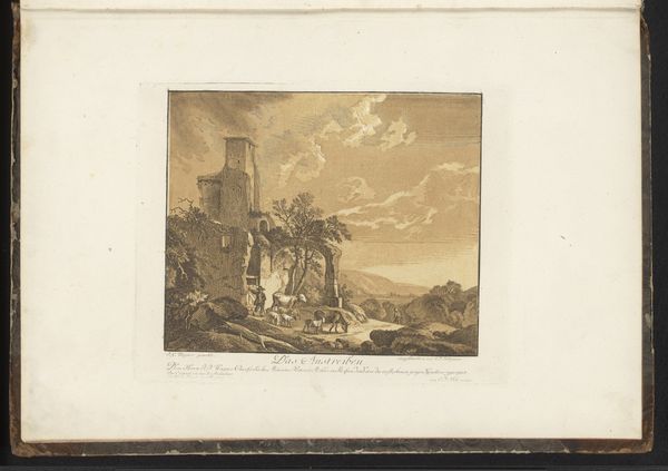 Editor: So, this is Jacob Wilhelm Mechau’s "Italiaans landschap met toren" from 1792, an etching printed on paper. The strong lines give it a somber, almost haunting feel, don't you think? How do you interpret this work? Curator: Haunting is an interesting word choice. To me, it evokes a powerful sense of cultural memory. See how the tower, clearly of geometric design, dominates the landscape? It’s a fragment, almost, of a once grand past. What symbols do you perceive within its ruin? Editor: I guess the tower symbolizes time and the weight of history. The figures look pretty small near it, and they contrast nature's power with something humans made, once. It brings to mind how little control we have. Curator: Precisely. Mechau uses the Italian landscape, bathed in Romantic sensibility, as a stage. The tower isn’t just a structure; it is a marker of vanished civilizations. What kind of impact could this artwork make on someone familiar with Italian Renaissance imagery? Editor: I imagine it would reinforce those ideas about lost grandeur, or inspire a sense of longing for a simpler, more “authentic” time before the rise of industrialization? Curator: Exactly. The tower as a symbol also reflects the individual's journey, weathered but not broken, existing in solitude within a vast, uncaring world. Editor: So it's both a historical artifact and a psychological landscape. The power of visual symbols, isn't it, carrying meaning across centuries! Curator: Indeed. Mechau offers us not just a view, but a meditation. It makes me think about continuity and the stories objects carry and share through the ages.