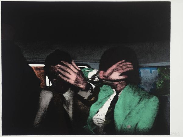 Curator: This acrylic on canvas is titled "Le peintre et son modèle" – or "The Painter and his Model" – by the French artist Gerard Fromanger. He painted it in 1974. It looks pretty big. I’d estimate that it must be nearly five feet square. Editor: That is a powerful painting. It immediately gives me the sense of witnessing something, like a scene playing out behind a curtain of color. Curator: Fromanger emerged as an important figure in the Parisian art scene following the events of May '68. We should see this image as related to Pop Art but deeply concerned with social issues. It seems like an effort to engage the relationship of painting with contemporary life, and especially street life. Editor: Absolutely. The overlay of red, the silhouettes, the lone green figure; the artist's control over contrast creates tension and a kind of detached observation. Tell me, what is happening in the background? Curator: We see a row of mannequins, and possibly shoppers; there’s definitely an advertising sign, though it is difficult to read in reproduction. You are right to see the artist observing a tableau of the fashion industry and commercial life as lived and experienced in France. Fromanger uses intense colors to engage and even provoke his viewers. I think he also invites the viewers to take their own places as witnesses and judges. Editor: So true. Notice how Fromanger balances the weight and texture, allowing colors and the implied lines between figures to give our eyes a clear route. He has created a composition using some brilliant formalism that is direct, but also sophisticated in its layers of colors and obscured forms. The green, for example. The symbolic figure, yes? Curator: I suspect you’re right. The street scenes that Fromanger loved gave him direct contact with real events and allowed him, and those of us who view them, to engage with debates over politics, labor, and how social change impacts us all. The figure may symbolize action, as one’s own place as a maker and a citizen. Editor: To me, there's an incredible feeling of observing this interaction without judgment but with intent and even curiosity. Fromanger seems to give us this intimate space to exist between observer and art. Thank you! Curator: A brilliant consideration, as always. It is tempting to consider oneself placed between this artistic event and to become our own figure within. Thank you for sharing your insight with me today!