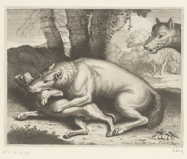 Curator: Here we have an engraving from between 1645 and 1680, titled "Romulus and Remus suckling the she-wolf on a riverbank." It's part of the collection at the Metropolitan Museum of Art. Editor: My first thought? A primal scene, charged with vulnerability and potential menace. The composition is interesting—very sharp contrast between the smooth bodies and the furry animal. Curator: Indeed. The artist employs stark tonal contrasts to define form and texture. Observe how light rakes across the musculature of the wolf, creating depth. The textures are quite remarkable for an engraving. Editor: Absolutely, but look at the deeper cultural symbolism. The she-wolf is a powerful archetype, the nurturer, even of those outside her natural order. And it resonates through cultural memory even now. It’s an incredibly potent symbol. Curator: Symbolism aside, consider how the arrangement generates meaning. The wolf dominates, looming over the infants, yet its posture suggests something other than pure aggression. It's a curious display of protection—or ownership. Editor: That ambiguity is exactly what makes it such a compelling image. The she-wolf could, at any moment, become the hunter. This engraving embodies the paradox of Rome's origin myth: violence and care intertwined. Curator: And technically, the engraving style amplifies that tension. The dense crosshatching builds a sense of unease and barely controlled power in that animal’s frame, even the thin and precise line-work doesn't quite alleviate. Editor: A foundational myth captured with raw feeling. Its visual impact is definitely amplified by that contrast you noted; vulnerability versus latent aggression—in such stark relief. Curator: Ultimately, this print, through form and careful attention to the natural, asks us to look beyond easy interpretations and question foundations. Editor: And its symbolic richness guarantees lasting relevance as long as the tale of Rome is told.