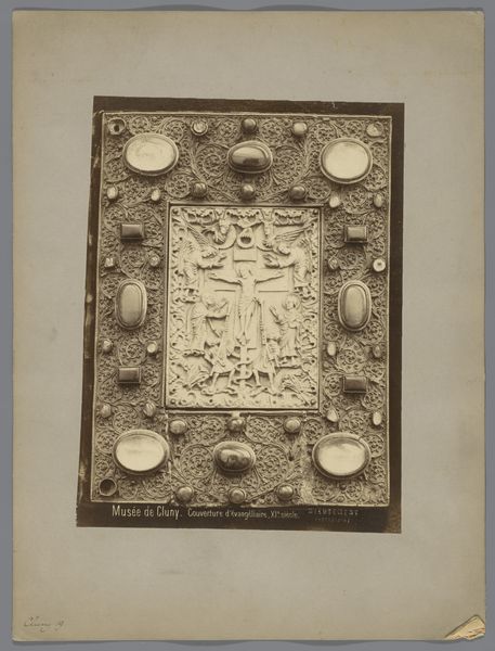 Curator: What a marvel of intricate detail! Giacomo Brogi captured this fotoreproductie of a ceiling painting in the Galleria degli Uffizi in Florence sometime between 1856 and 1881 using the albumen print method. Editor: My neck already hurts just looking at it! I imagine craning up to admire that in person... It’s this swirling cosmos of classical figures and architectural doodads, all suspended in a sepia dream. Quite a Baroque ballet frozen in time. Curator: Indeed. Note the distribution of weight. While at first glance, the imagery may appear chaotic, a rigorous system of geometric divisions and contrasting forms stabilizes the whole. Observe how each vignette is carefully framed, echoing the larger structure. Editor: Echoes, yes! I'm picking up visual rhymes everywhere. See how the cherubs in the corners mimic those central figures, like mischievous children acting out scenes from above? There's a definite playful intelligence at work. Plus the muted palette, sepia like an old photograph or dream... feels wistful, maybe even slightly melancholy. Curator: Precisely. The albumen print enhances that sense of bygone grandeur. The contrast isn't merely tonal; it reflects a tension between the ostentatious display of power inherent in Renaissance art and the fading grip of that power as photographed by Brogi in the 19th century. The image transforms from artwork into a relic. Editor: Ah, a relic viewed by a relic! So much history layered here, even though the original ceiling is the 'main' art. This makes you wonder about how the original audience viewed the frescoes versus how someone in the 19th century experienced a black and white version. Curator: Exactly! This photographic rendering reframes the entire spectacle for a modern gaze, stripping it of its original color and immediacy but adding layers of temporal complexity to it. Editor: Well, I am now completely convinced that looking at the ceiling through Brogi’s eyes is a new and intriguing way to encounter Renaissance excess. Curator: Quite. By analyzing Brogi’s calculated choices, we unearth how art historical documents can have meanings which go far beyond just recording an original.