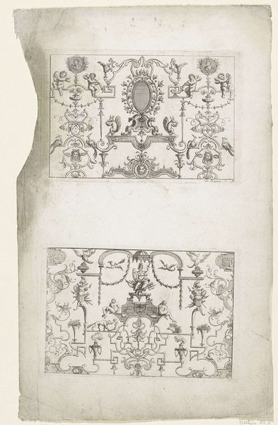 This is a print made by Lorenz Beger in Germany in the late 17th or early 18th century. The image presents a design for a decorative panel, filled with classical motifs. Looking closely, one can see a woman on a throne accompanied by two figures playing musical instruments beside a vase. But note how the design also incorporates winged figures and elaborate ornamentation. In its time, this print would have been a source of inspiration for artisans and craftsmen. The print reflects the taste for classical themes that was prevalent in European art and design during the Baroque period. It’s also an interesting document of the art world in a period when prints were becoming increasingly important as a means of disseminating artistic ideas. Further research into Beger's career and the patronage system in Germany at the time would help us better understand the social conditions that shaped this print's creation.