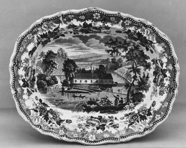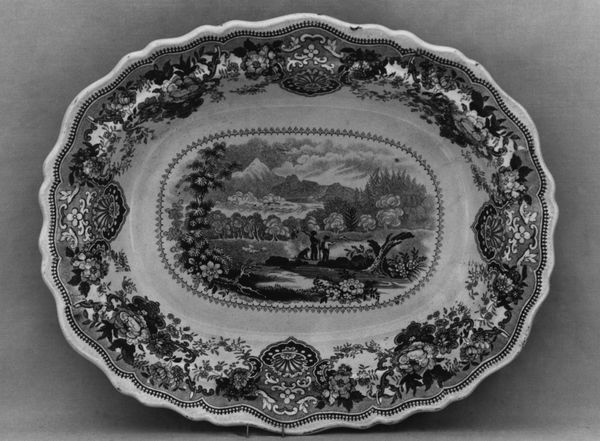 Curator: Before us, we have a piece entitled "Platter," made between 1837 and 1853 by Thomas Godwin. The piece you see before you uses print on earthenware. Editor: Well, the initial impression is overwhelmingly domestic, despite that open vista. It's a constrained landscape, literally framed. Curator: Precisely. The form itself is crucial; it is, after all, a platter—a utilitarian object. The transfer print method democratized art production in England. The decorative program and symmetry are crucial to the function. Editor: And what an odd coupling – this serene almost pastoral scene amidst the urban backdrop and sailing vessels on what looks to be a busy waterway. It’s not what you’d expect to see on an everyday piece of crockery. Curator: The composition directs the viewer’s eye, from the romantic foreground figures to the smokestacks of the distant factories and churches, guiding us through a hierarchy of values embedded in the piece. Editor: Indeed, a commentary on burgeoning industrialization depicted through popular genre painting with symbols of tranquility such as romantic couples enjoying the scenery. It creates tension and perhaps, points to what’s being lost. Curator: Don't forget the floral border—an overt symbol of cultivated nature acting as a frame for civilization’s expansion. It is this intentional construction that speaks volumes about the anxieties of the time. Editor: A beautiful interplay, that tension. Even an object for the dinner table reflects broader cultural tensions. I can see how someone would cherish it. Curator: Seeing these objects reminds us how potent visual messaging can be, even on mundane items. The artist uses these symbolic devices, making a simple design something rather more intricate.