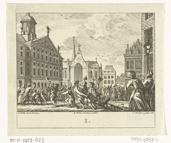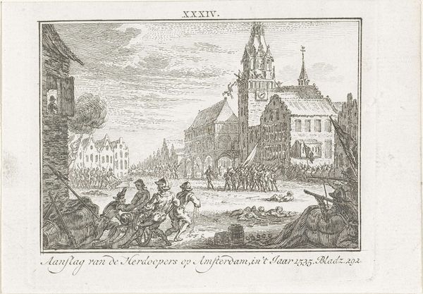 Editor: So this print, "Groningen Conquered by the Troops of Rennenberg, 1580," was created by Simon Fokke between 1782 and 1784. The scene itself feels so charged, all this detailed action packed into a small space. It makes me wonder about the real story and the artist’s intent in depicting it this way. What stands out to you when you look at it? Curator: You know, I'm always drawn to these historical prints—they’re like tiny time capsules, whispering stories of ambition, conflict, and the human condition. Look at how Fokke manages to capture the chaos and drama, not just of the conquest, but also the *idea* of it, all those implied noises, that sense of smoke hanging in the air...it's practically baroque in its busyness! The composition really exaggerates this dramatic tension: the skyline feels incredibly distant given the closeness of the immediate fight. Is he telling us something about Groningen’s position relative to the power structures, do you think? Editor: That’s a cool way to see it. I hadn’t really thought about the skyline. It does feel removed. Like Groningen is sort of under siege, in more ways than one. The busyness almost makes the people blend in—you lose a sense of the individual soldiers. Curator: Exactly! What might Fokke be telling us about individuals vs. collective forces, then? Remember, this was printed much later than the event it depicts. Is he subtly commenting on power dynamics in *his* time through the guise of historical representation? The perspective plays tricks, too. It feels both close and incredibly distant all at once. Do you think this contributes to any reading you can discern from this engraving? Editor: It's like the chaos is meant to overwhelm the individual, the perspective almost putting us in the middle of it. But the clarity of the print, it sort of makes the whole event distant—historical. It's interesting how all these details add up to a feeling that’s more complex than just a battle scene. Curator: Precisely! It’s about looking beyond the obvious narrative, and probing into the unspoken perspectives woven into the artwork itself. Makes you wonder what other old prints are *really* trying to tell us, eh? Editor: Absolutely, I'll never look at prints the same way again. Thanks!