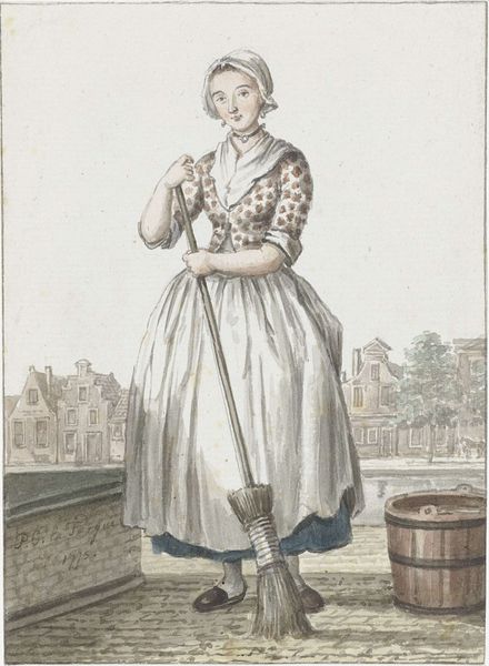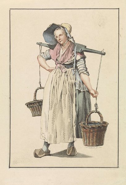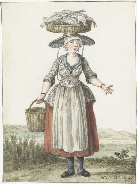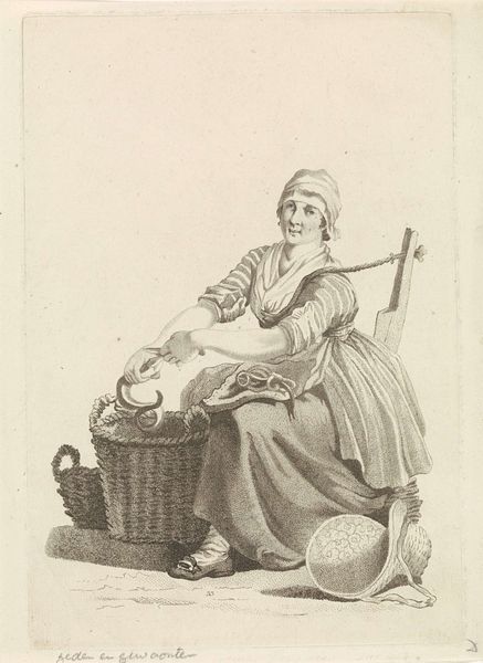 Curator: Here we have Mathias de Sallieth’s "Seated Peasant Woman with Basket," a pencil drawing dating, possibly, from anywhere between 1772 and 1833, now held in the Rijksmuseum. Editor: I'm struck immediately by her posture. She seems tired, burdened. There's a certain resignation in the way she's leaning. Is that a yoke behind her? Curator: Precisely. This drawing presents us with an interesting view into 18th- or early 19th-century Dutch society. Genre paintings like this one served to document, but also perhaps to romanticize, rural life for an increasingly urban audience. It offers a glimpse of everyday labor. Editor: Romanticize, perhaps. But consider the reality. The artist has captured her fatigue so viscerally, but that hat reads to me like an aspiration for something beyond manual labor, maybe it signifies that she sells at the market. Her finery almost accentuates her exploitation, or the class exploitation implied by genre portraiture itself. I find myself asking, who was the audience, and what was their relationship to her labour? Curator: It is vital to ask those questions. We should recognize how representations of class have functioned throughout art history. Think about how these images shaped perceptions and perhaps even reinforced social hierarchies. The artist chose to represent her with this level of detail, inviting observation, if not empathy. Editor: I find it a bittersweet image. On one hand, it grants this woman, likely nameless in the historical record, a certain permanence, a visual record of her existence. But on the other, it's filtered through the artist’s, and our, own lenses of privilege. Does her story get erased to feed the demands of portraiture at the expense of reflecting her economic precarity? Curator: It's a point well-taken, underscoring the layered nature of viewing historical artworks. Editor: Thinking about art through the lens of labor can truly offer us an enriched vision of art. Curator: Absolutely, a reminder to view art as not just an aesthetic product, but a mirror reflecting broader socio-economic forces.