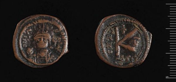 Curator: This is a Large Follis, a Byzantine coin, dating back to the reign of Anastasios I in Constantinople. It's quite small, but dense. Editor: It appears aged, its surface texture speaking volumes about its journey through time. The material looks like worn bronze. Curator: Coins like this were crucial for trade and governance in the Byzantine empire. The weight, about 16.7 grams, was carefully controlled for economic stability. Editor: Notice the portrait on one side, likely of Anastasios himself, which speaks to the power dynamics and the role of imagery in political messaging. Curator: Indeed, the inscription and the "M" symbol, representing the denomination of 40 nummi, reveal the mechanics of imperial administration and economic exchange. Editor: It's remarkable how such a seemingly simple object embodies the intersection of labor, material value, and the socio-political landscape of its time. Curator: Absolutely, it allows a glimpse into the intricacies of the Byzantine world. Editor: A small token offering an invaluable history lesson.