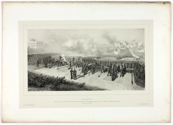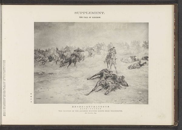 Curator: Here we have "The Japanese Infantry Storming the Etse Hill Forts," a print made before 1895 by the Ordnance Survey Office. It appears to combine engraving and photography on ink and paper. What are your initial thoughts? Editor: My breath actually caught a bit. It feels… chaotic. So many figures blurring into a smoky landscape. It evokes that feeling of being caught in the churn of something enormous and impersonal, something undeniably tragic. Curator: The composition certainly contributes to that feeling. The blurred lines, the sense of relentless forward motion… We have to remember this was produced by the Ordnance Survey Office. This isn’t a purely artistic endeavor. There’s a documentary and perhaps even propagandistic intention behind it. The act of creation and dissemination – printing, photography, and engraving. What does that process emphasize for you? Editor: It speaks to scale, doesn't it? The use of photography points to a desire for authenticity. It suggests a scientific capture of reality, then coupled with the precise labor of engraving it underlines human skill and precision. So the combination tries to give us, as viewers, what? Some kind of ‘true’ image of war? But the very means of its production also serve to sanitize the horrors that lay under it, in the bodies. Curator: Indeed. Consider the use of ink and paper; relatively accessible materials which underscore a need for reproducibility. This image, documenting the Japanese storming of the Etse Hill forts, becomes accessible, shared widely, solidifying a specific perspective on the conflict. Editor: It's also striking how devoid of individual expression each soldier appears. They are simply marks, lines making up the surge. Makes you think about the role of the individual against this war-machine context. Is it meant to glorify military action? To simply illustrate it? Curator: Good questions. Its realism and "history painting" label definitely lean into glorification, maybe that makes sense in light of Japan's rising power. We tend to forget that photographic and engraving techniques are far from objective – the printing and distribution chain here serves specific colonial and military purposes. Editor: So, ultimately we see not only the representation of the military’s action itself but an illustration of the means used to produce it – the machines, materials, hands at work. Curator: Precisely! A sobering thought, considering what the artwork depicts. Thank you. Editor: My pleasure. The ghost in this machine seems all too hauntingly present today as well, doesn't it?