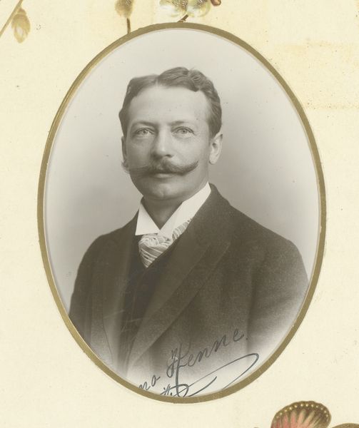 This is Gustaf Alfred Johanson Dahllöf's photographic 'Portret van een man met vlinderstrik en twee insignes'. The photographic print, with its muted grayscale palette, presents us with a study in contrasts. The man's formal attire, complete with a bow tie and insignia, creates a visual hierarchy, drawing our eyes to these markers of status. Consider how Dahllöf uses the inherent qualities of photography—its capacity for capturing detail and texture. The subject’s gaze is directed slightly off-center, inviting us to speculate about his thoughts and motivations. The composition adheres to classical portraiture conventions, yet, the formal arrangement of the sitter is framed within a semiotic system, where each element communicates aspects of identity and social standing. The photographic medium itself is not merely a passive recorder of reality, but rather a constructed representation of identity. As you move on, consider how the formal elements of portraiture function not just aesthetically, but as a reflection of broader social and cultural dynamics.