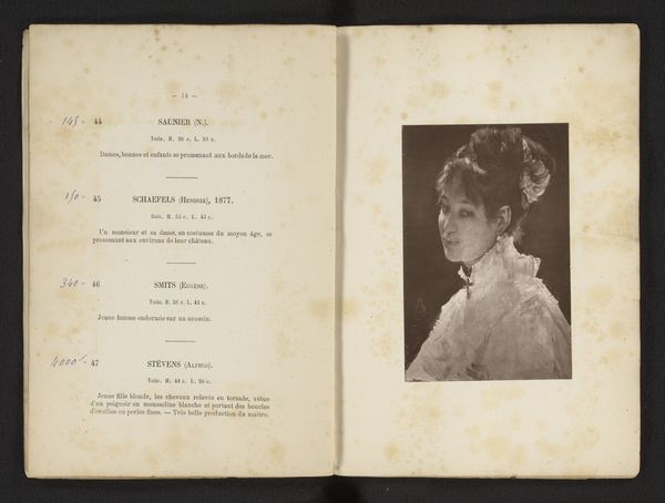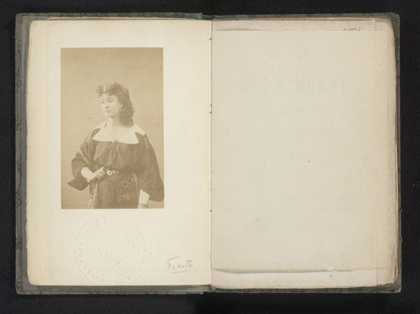 Editor: Here we have "Portrait of an Unknown Woman," attributed to J. Lacroix, a gelatin-silver print from before 1897. It has a certain antique feel. What captures your attention in this image? Curator: What's fascinating is not just the image itself, but the book it resides in. It’s part of a larger system of photographic production and dissemination. Consider the materiality of the print, the cost of the gelatin-silver process in the late 19th century, and how that material value dictated who could be represented and who consumed these images. Editor: So, you're thinking about access and cost? Curator: Precisely! The materials aren’t neutral; they dictate the social life of the photograph. Pictorialism as a style is itself intertwined with material processes—the manipulation of the gelatin silver print to mimic painting elevated photography but simultaneously revealed its constructed nature and the skilled labor involved. Do you see how the aesthetic choices reflect a striving for artistic validation, yet rely on industrial processes? Editor: That's a good point. I hadn't really considered it as labor. Curator: And think about who "unknown woman" is – her anonymity further complicates the photograph's consumption. Was this a commission? A studio portrait intended for wider circulation? The lack of individual identity allows her image to be repurposed, consumed as a type, reinforcing societal norms or perhaps challenging them subtly through her posture and clothing. It speaks volumes about the commodification of image-making at the time. Editor: This gives me so much to consider—the materials shaping access, the labor involved, and the broader cultural context impacting who and how people are portrayed. Curator: Indeed. Focusing on these elements illuminates the complex networks connecting artistic intention, material production, and social reception.