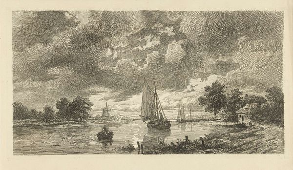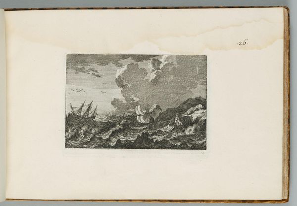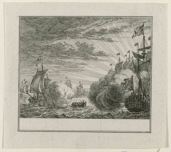 Editor: So, this is "Watersnood bij Halfweg, 1775", an etching by Simon Fokke from 1775, held at the Rijksmuseum. It’s monochromatic, with a somewhat frantic feel. What do you make of it? Curator: Immediately, I'm drawn to the way the piece functions as a form of public record. Images like this, circulated as prints, served as vital documents for conveying information about disasters. What do you notice about the human figures in relation to the environment? Editor: They seem so small and overwhelmed by the storm, almost insignificant against the raging water and dramatic sky. It really emphasizes the power of nature. Curator: Exactly. Consider the windmill in the background, typically a symbol of Dutch prosperity and ingenuity. Here, it’s dwarfed by the flood. This image participates in a long history of representing the Dutch struggle against the sea, but it also speaks to the socio-economic impact of such events. Who do you think might have commissioned or purchased this type of print? Editor: I’d guess it was purchased by people interested in historical events, maybe the wealthier classes who could afford art… almost like a newspaper photograph of its time? Curator: Precisely! It’s crucial to remember the role of prints in disseminating news and shaping public perception. Fokke isn’t just creating an artistic image, he is creating a piece of historical documentation consumed by the public, shaped by the institutional landscape and power. I wonder how this image was regarded compared to written accounts? Editor: I hadn’t thought of it that way before, as almost an early form of visual journalism and how that played out in Dutch society! It definitely adds another layer to the image. Curator: Indeed. Thinking about its reception in the context of 18th-century Dutch society gives us a much richer understanding of the print's purpose.