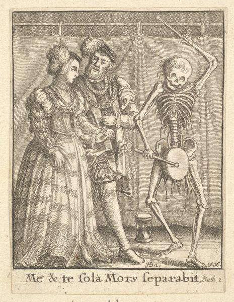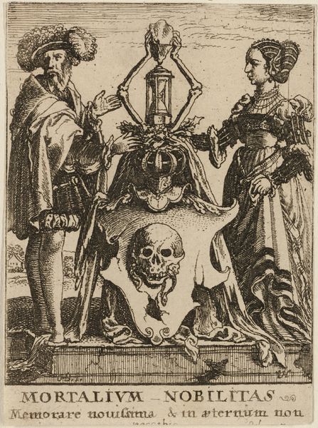 Albrecht Dürer crafted this intriguing engraving, "Wapenschild met vrouw en wildeman," with meticulous detail. The composition is immediately striking: Dürer employs strong diagonal lines to guide our eyes across the scene, from the vulnerable skull at the bottom to the crest with wings at the top. He juxtaposes life and death by placing a skull at the base of a shield surmounted by leaves and a winged crest. To the left a wild man whispers into the ear of a woman with a melancholic expression, a formal choice that suggests a narrative tension between savagery and civilization. Dürer's mastery of line creates texture and depth, from the woman's flowing gown to the wild man's coarse fur, yet it raises semiotic questions rather than answers. What do these contrasting forms signify, and how do they challenge fixed notions of power, gender, and morality? The image serves as a tableau of contrasts, inviting us to question the symbolic systems and cultural codes of Dürer’s time. It's a vivid example of how printmaking can be used to engage with philosophical discourse.